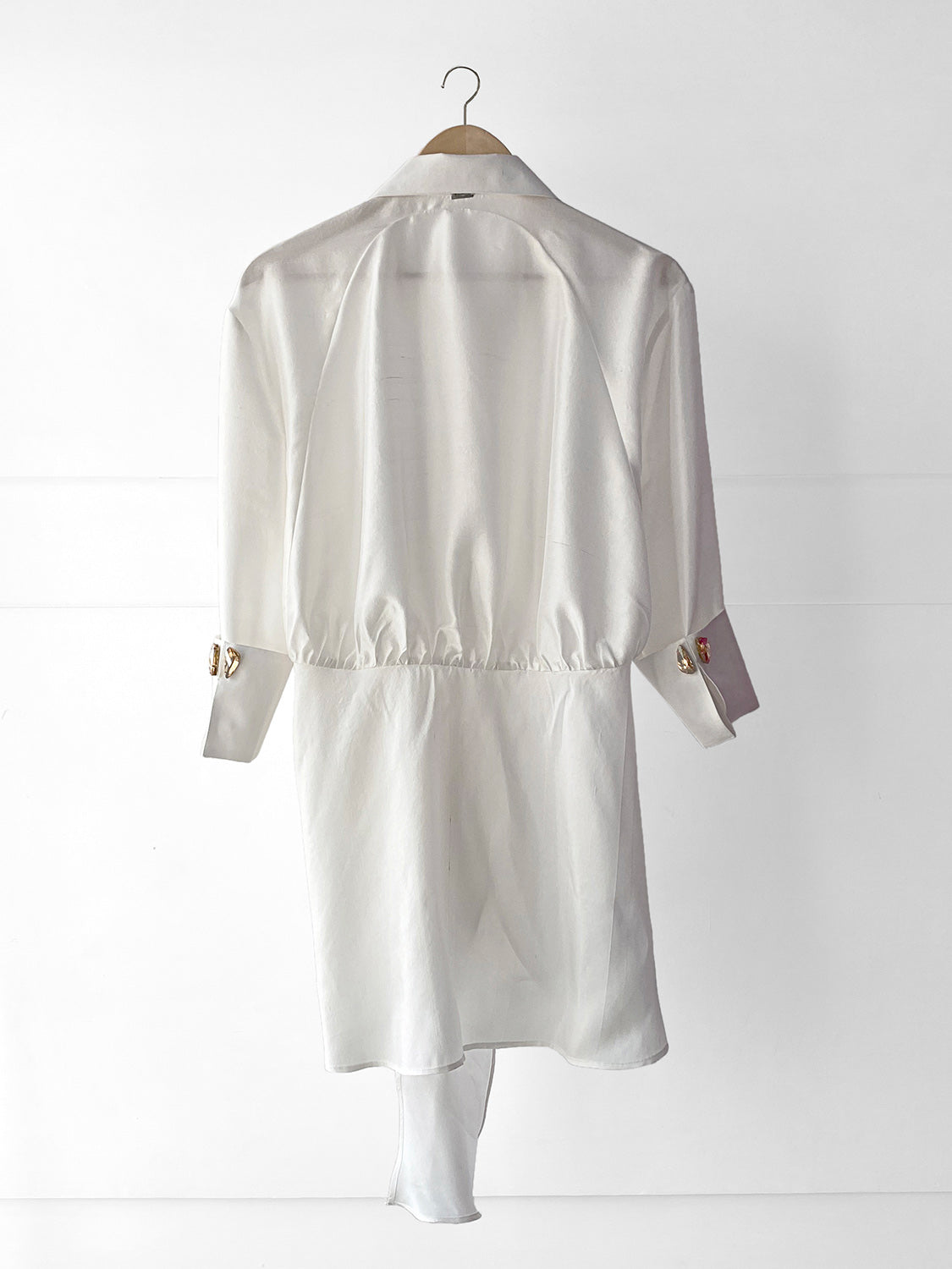 Taking our love for knot shirts a level up this season with the new Ace Shirt. Crafted in silk, the longer back covers the hips and the knot in the front covers the stomach. The sleeves are rolled up and enhanced with a statement stone in a contrast colour.