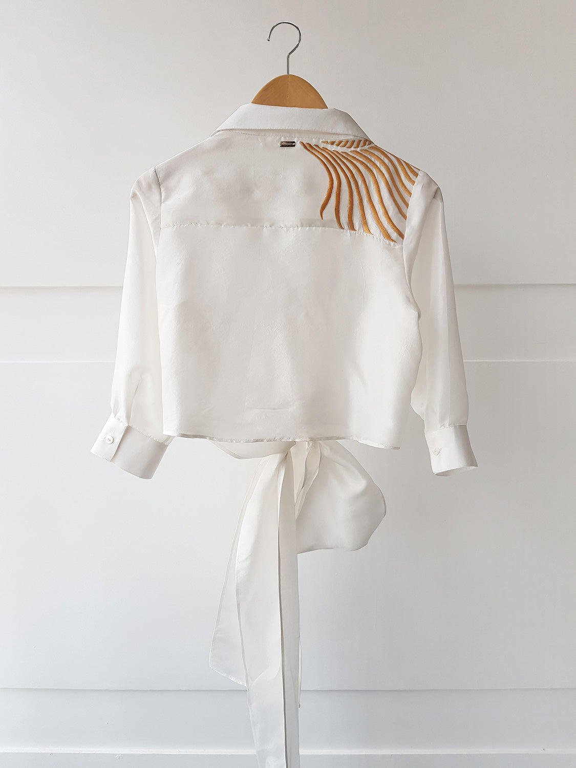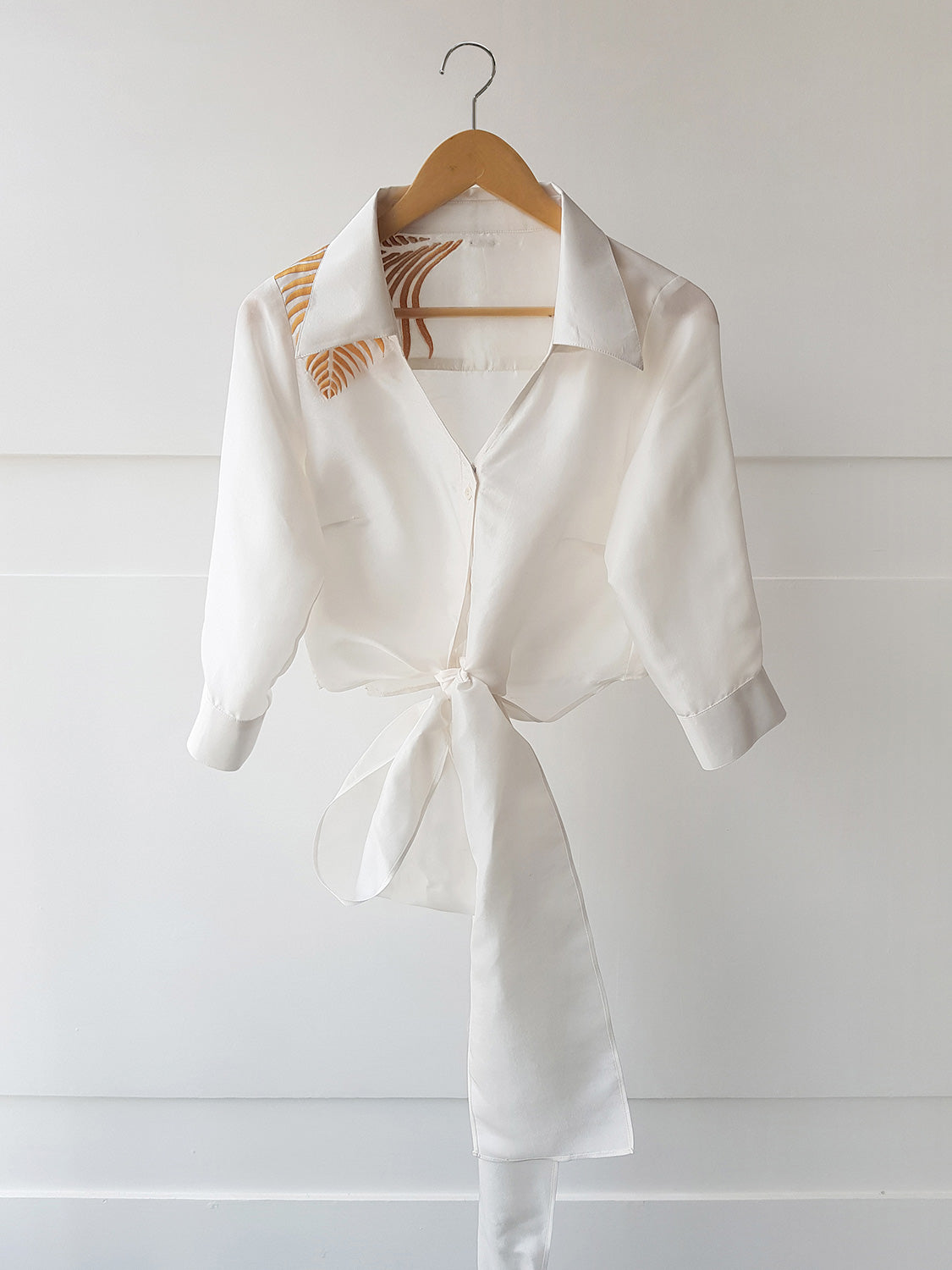 An updated version of the Ken Shirt, The Flora Ken has an embroidered leaf motif on the shoulder. It wraps around the body to tie up either in the front or the side. With 3/4th sleeves and lightweight fabrication, the shirt can be worn through out the year.