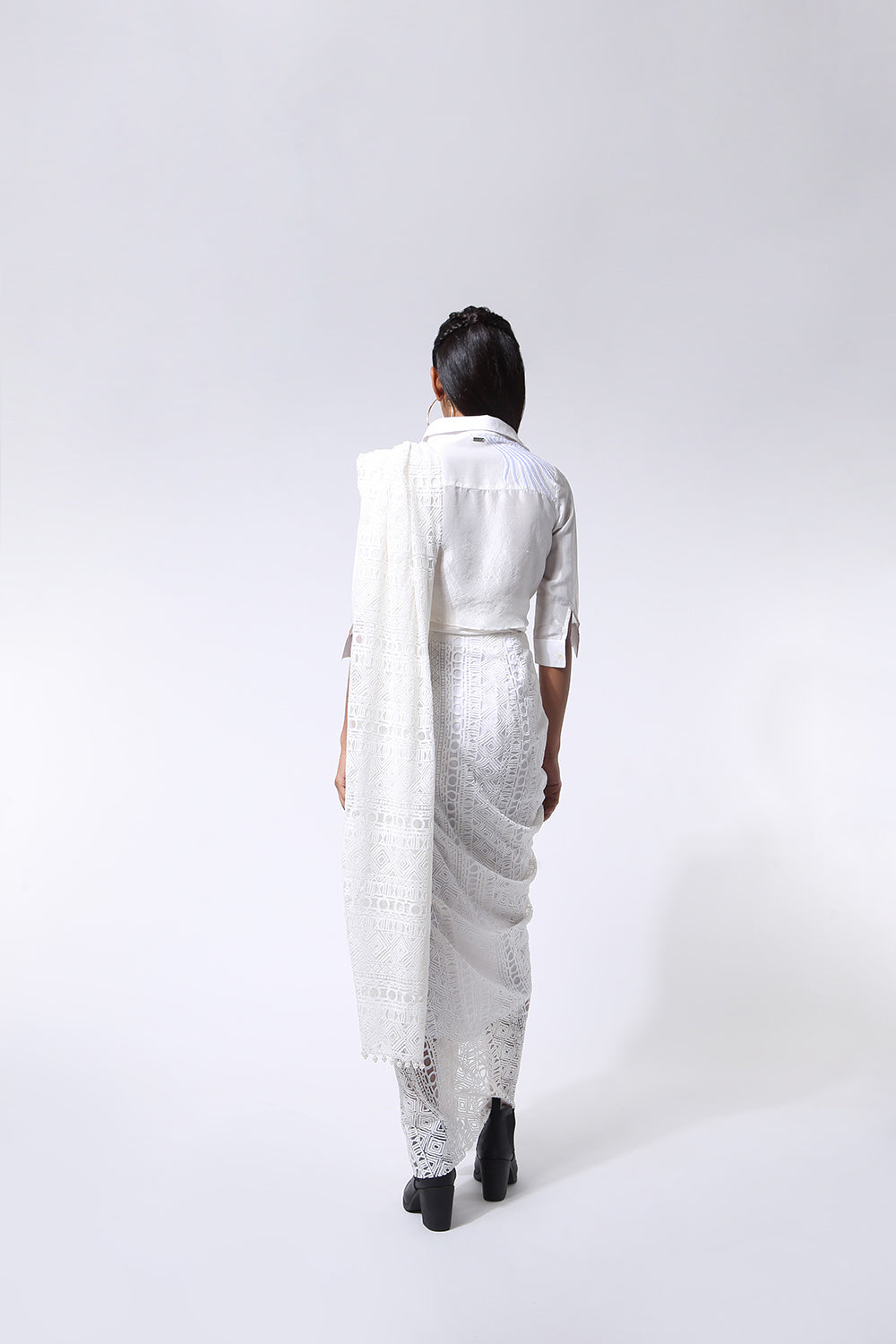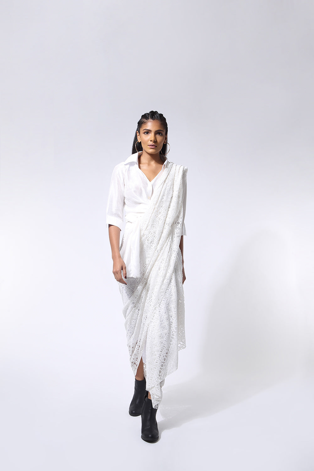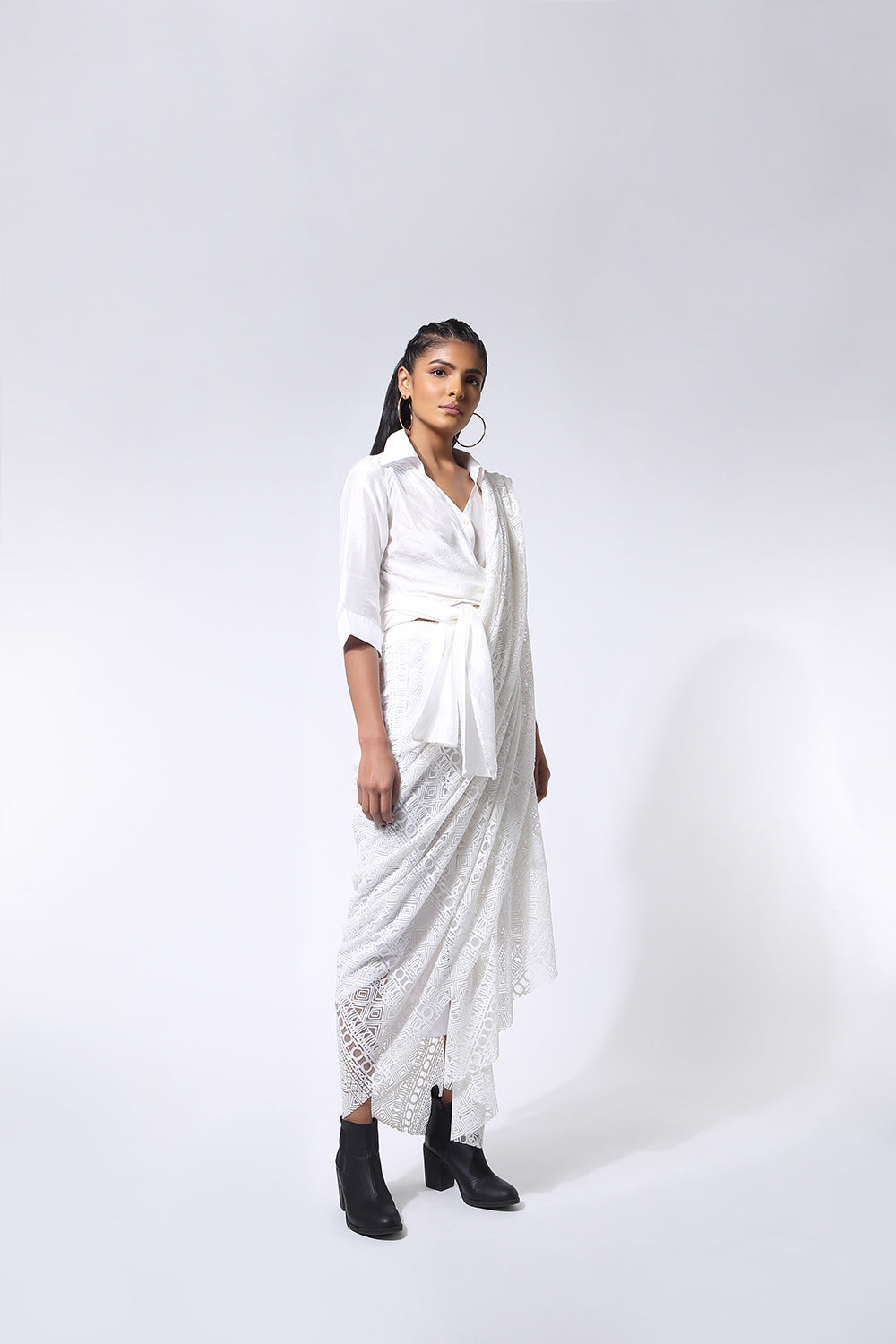 An updated version of the Ken Shirt, The Flora Ken has an embroidered leaf motif on the shoulder. It wraps around the body to tie up either in the front or the side. With 3/4th sleeves and lightweight fabrication, the shirt can be worn through out the year.