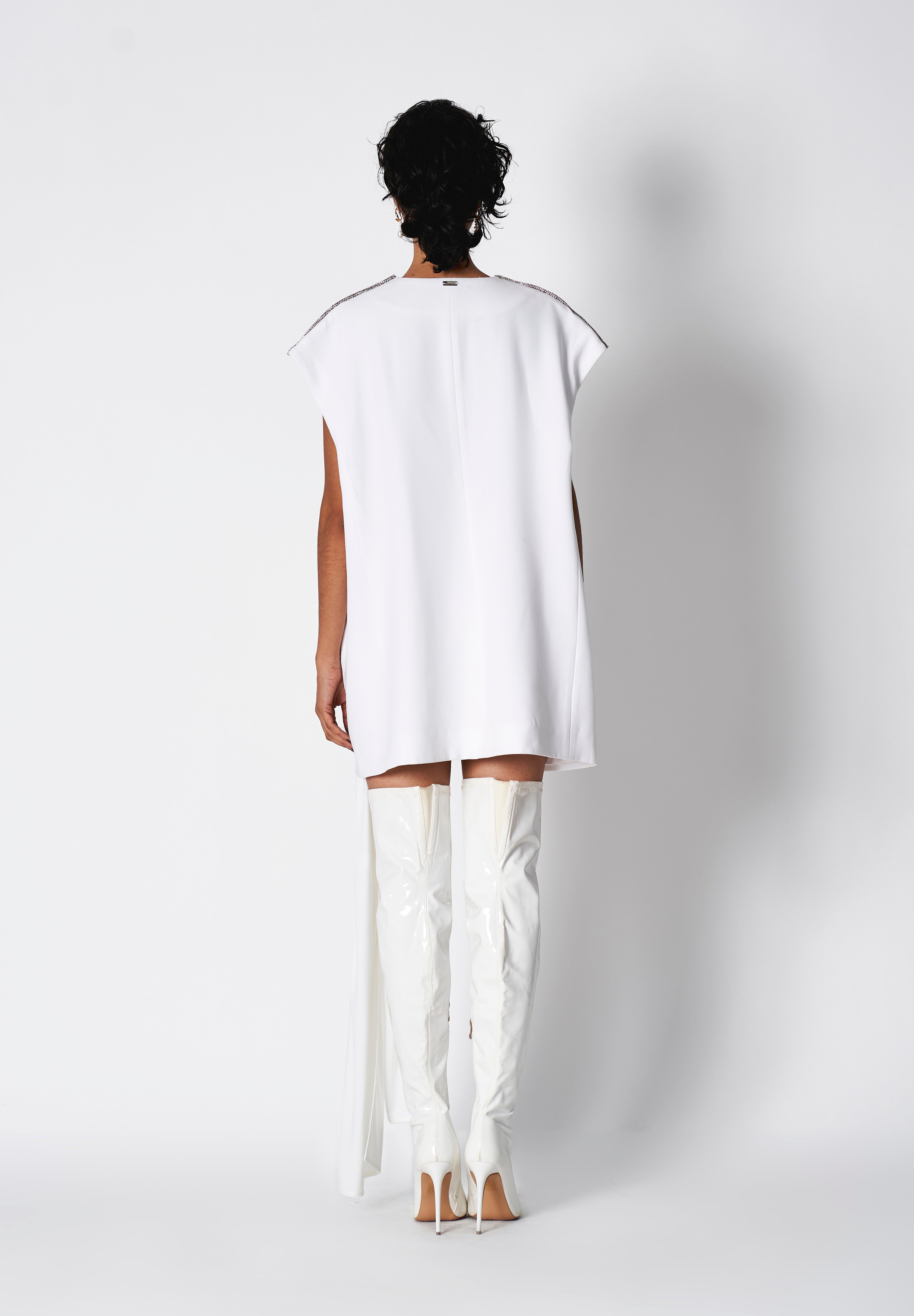This airy jacket features a deep-V neckline, with an oversized fit. Shoulders are detailed with jeweled embellishment which accentuates the look to a whole new level.
