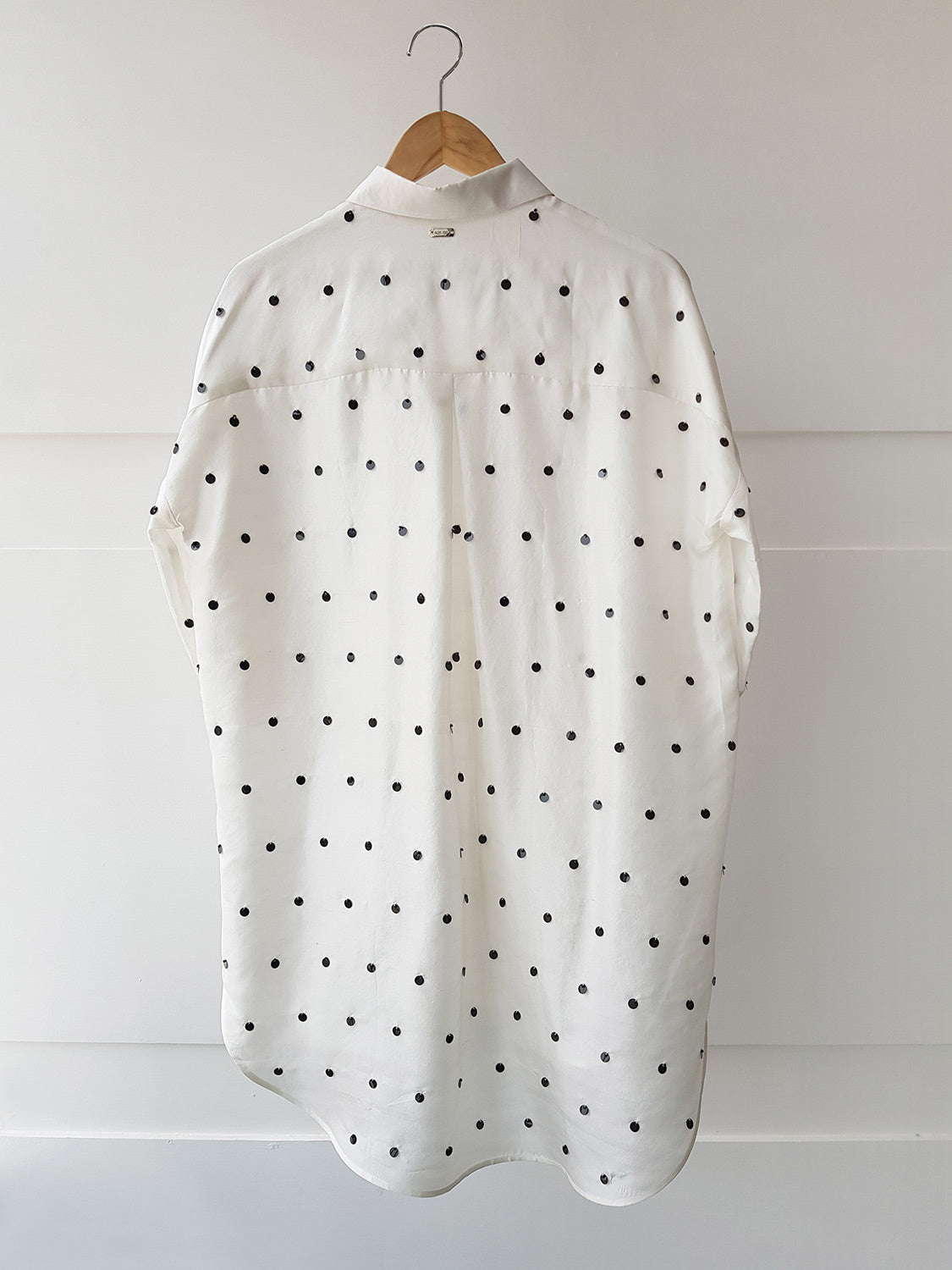 A Classic button-up, the Ladybug Shirt is a favorite with its effortless ease. Scattered with hand embroidered sequins all over, the shirt is a mid thigh length and has 3/4th sleeves.