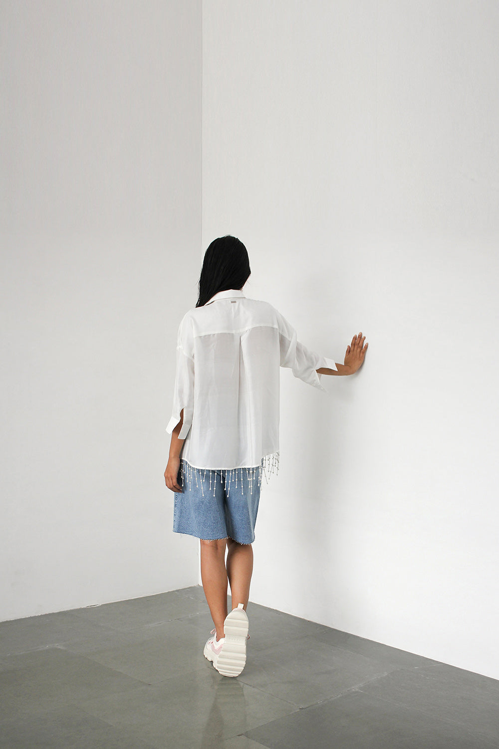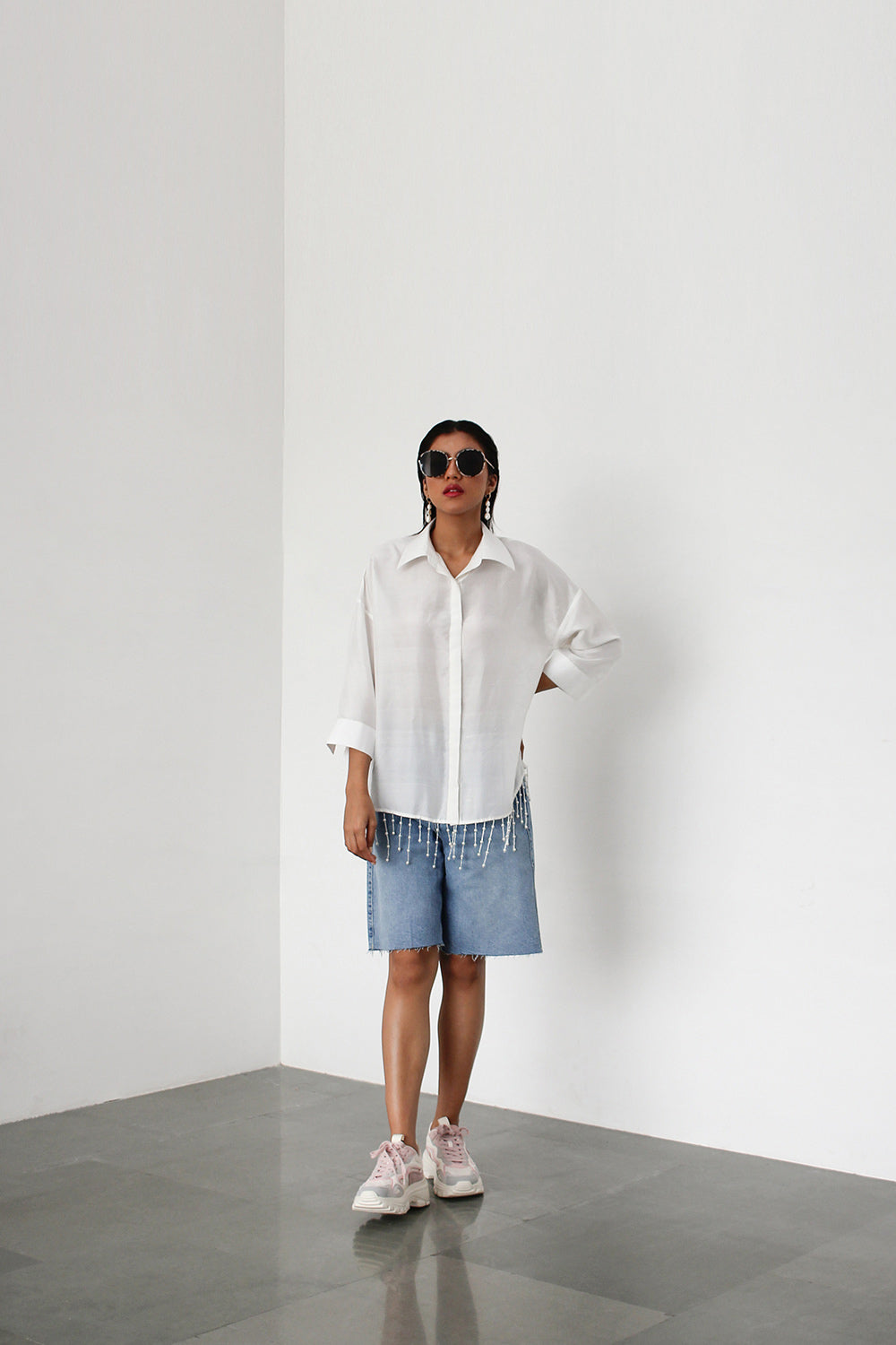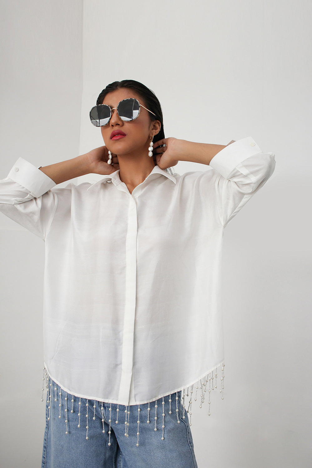 The Pearl Drop Shirt is the perfect combination of comfort and glamour with its easy fit and an added string of pearls that hang down the hem of the shirt. It comes with a concealed placket and 3/4th sleeves. The shirt is made of a beautiful lightweight silk that keeps you comfortable throughout the day.