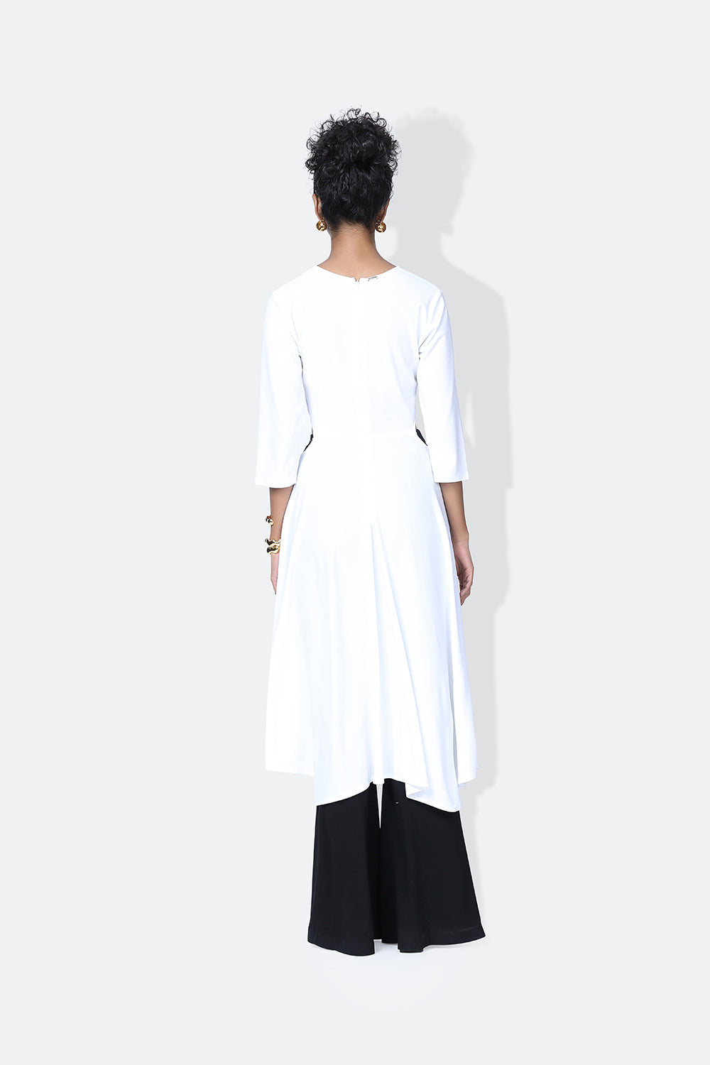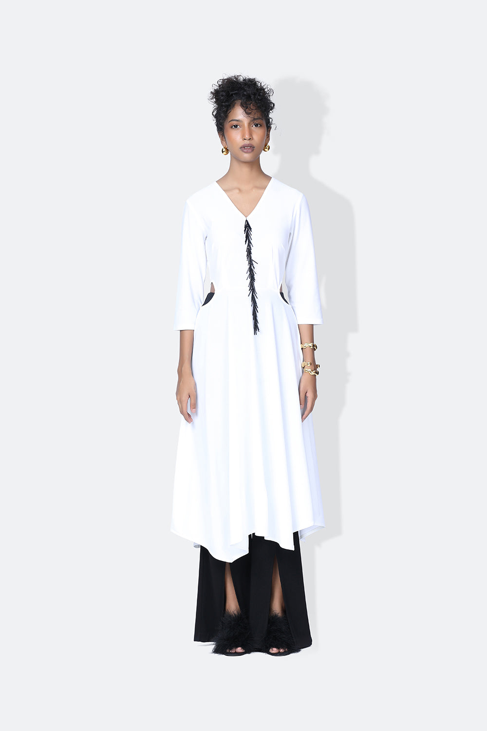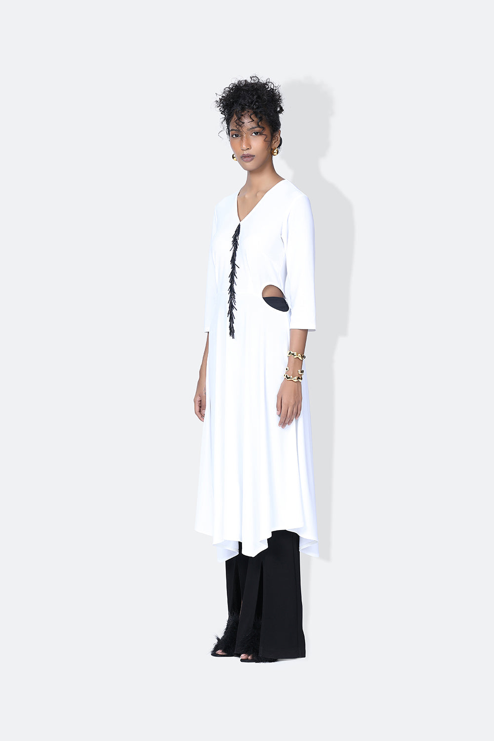 Our Pina set with features a mid length V neck dress in jersey with boot cut trousers, with a hanging embroidered detail from the neckline. Dress it up with a pair of heels and some jewellery.
