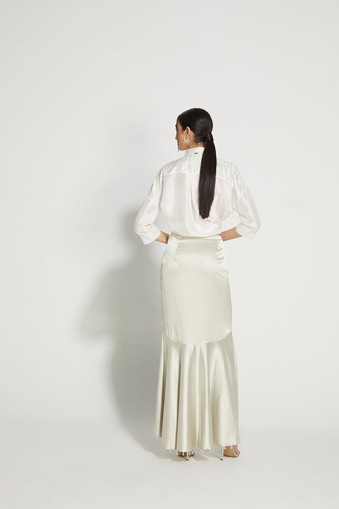 This is the shirt that you will wear with your denims as well as your lehengas. Hand embroidered with delicate details, our Streamlined Shirt features strings on the shoulder that are fun, flirty and give just the right amount of bling. Crafted in silk, it brings life to whatever you pair it with.