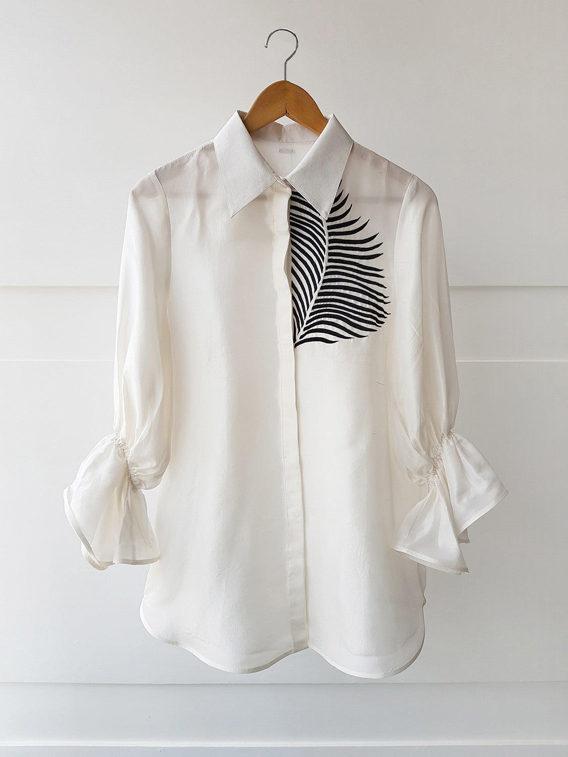 The Yoke Shirt is a relaxed fit shirt with an embroidered leaf pattern on the left shoulder. The elasticated detail on the sleeve adds to the drama and takes you from day to night.