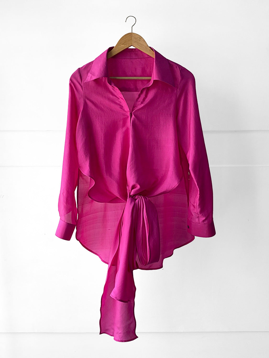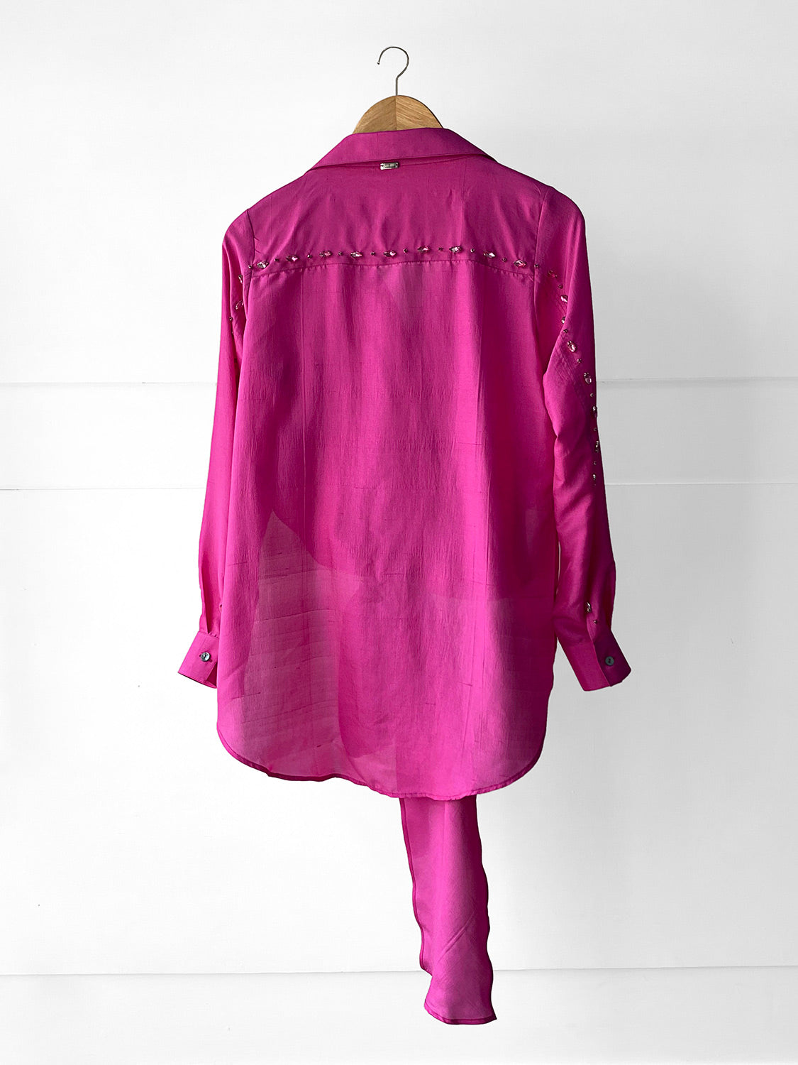 An all season favourite, the Jim Shirt comes in a high-low pattern with a longer back and shorter front that wraps around your body with a tie front detail and accentuates your waist. Hand embroidered crystals along the side of the sleeve and across the back gives it an added flair.