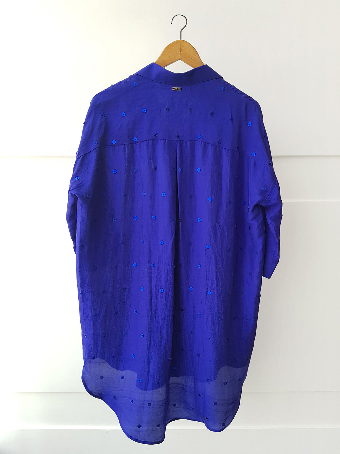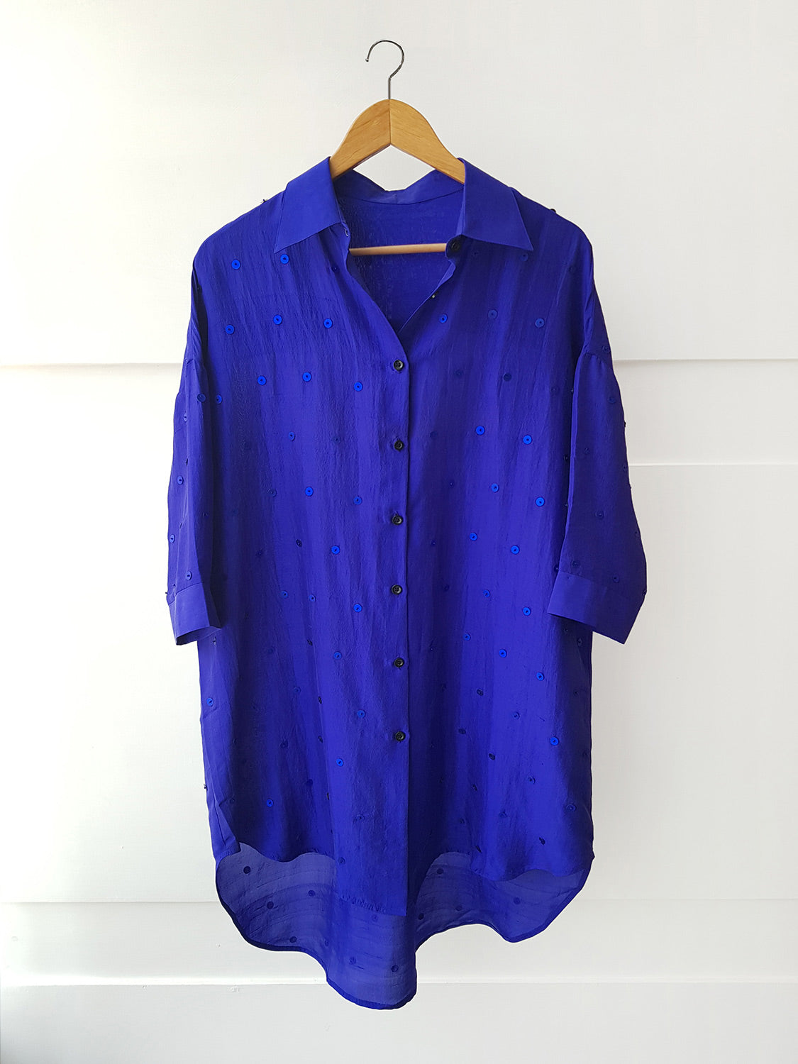 A Classic button-up, the Ladybug Shirt is a favorite with its effortless ease. Scattered with hand embroidered sequins all over, the shirt is a mid thigh length and has 3/4th sleeves.
