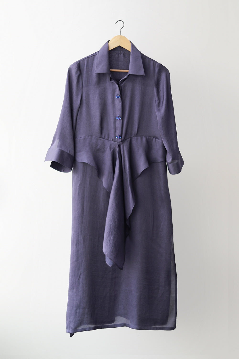 This Maxi Knot Kurta Set  will be your go to on days you can’t decide what to wear. The calf length kurta has slits on the side, a 3/4th sleeve length and crystal embroidered buttons. Designed with an extended panel that ties up at the front perfectly cinching the waist. Pair it up with its wide cut pants and you’re good to go.