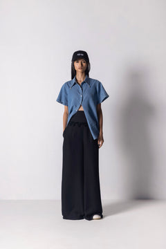 The AK Denim Shirt has a boxy fit with a tie front detail that accentuates your waist. The collar has been enhanced with a delicate crystal embroidery to give it that subtle glam.