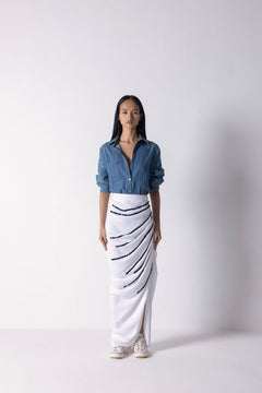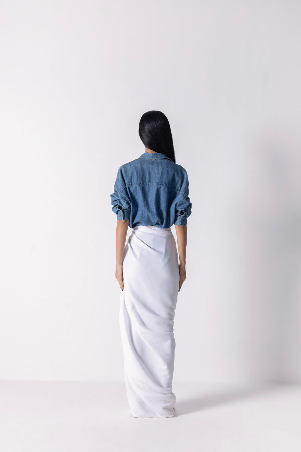 The new drape for the season, The Kjo Skirt has a side drape detail coming towards the front. Cut in a luxe crepe, it takes the shape of your body and comes with a broad waistband and side opening. It is really easy to wear and will make you stand out in the crowd.