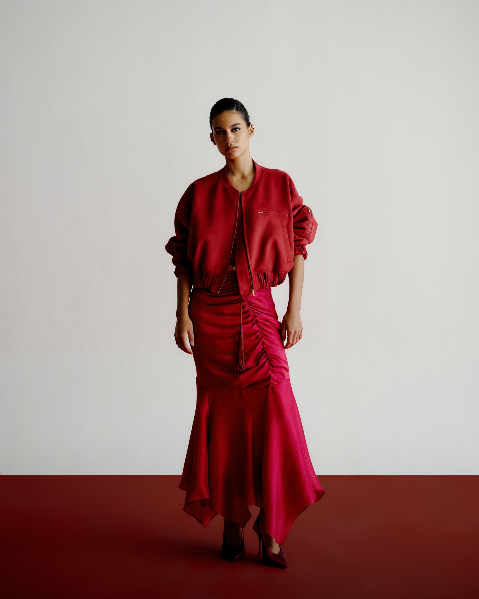 The 431-88 Aster Skirt in red is a contemporary reinterpretation of classic draping with a modern edge. Crafted in a lustrous silk-blend fabric, the skirt features meticulous ruching along the front that accentuates the form while creating fluid movement. The asymmetric hemline adds a sculptural touch. Designed for versatility, this skirt pairs effortlessly with structured tops or relaxed drapes — embodying 431-88’s signature fusion of sensuality and ease.