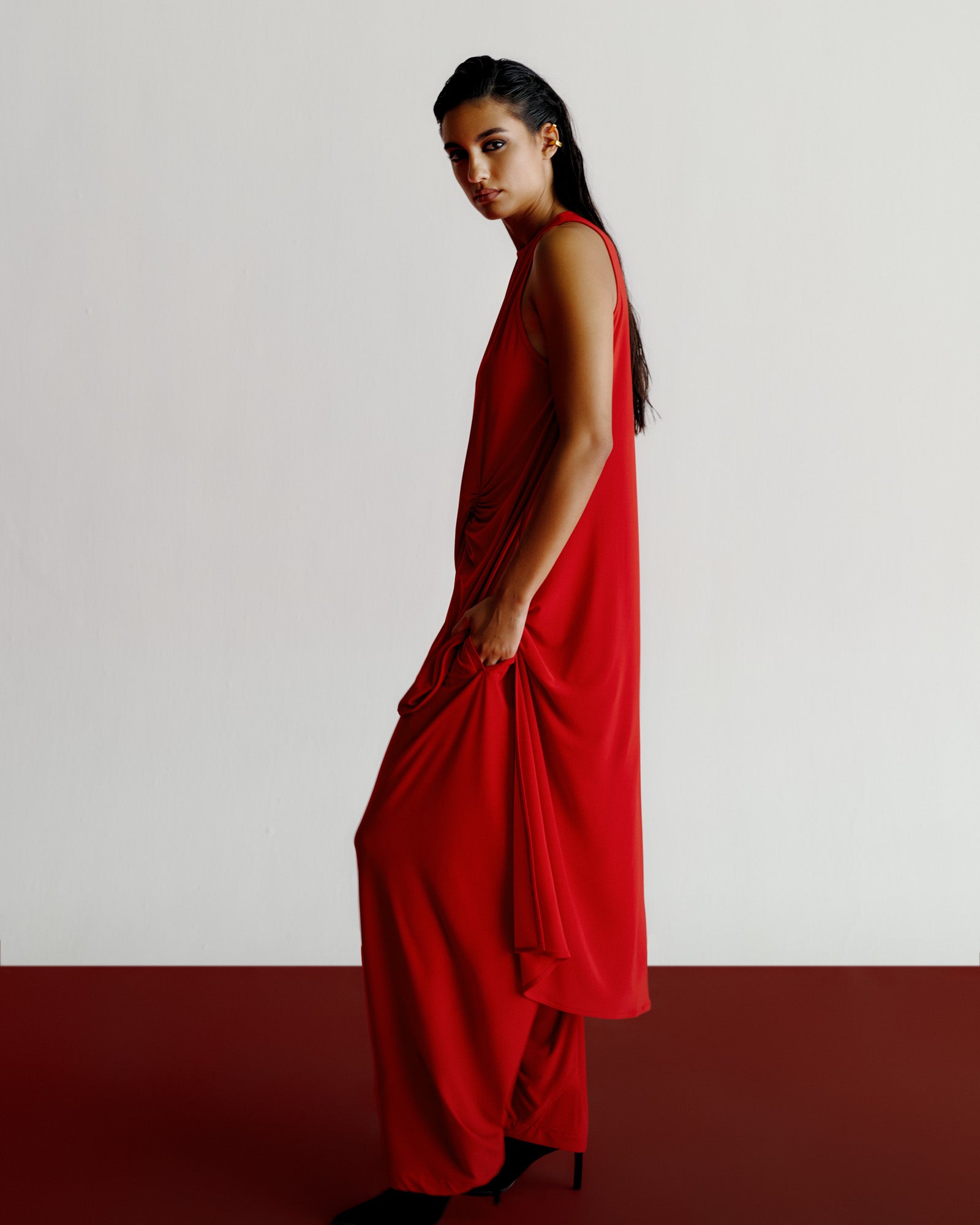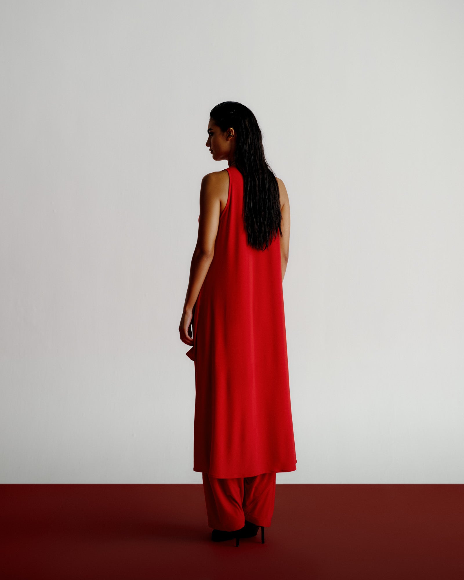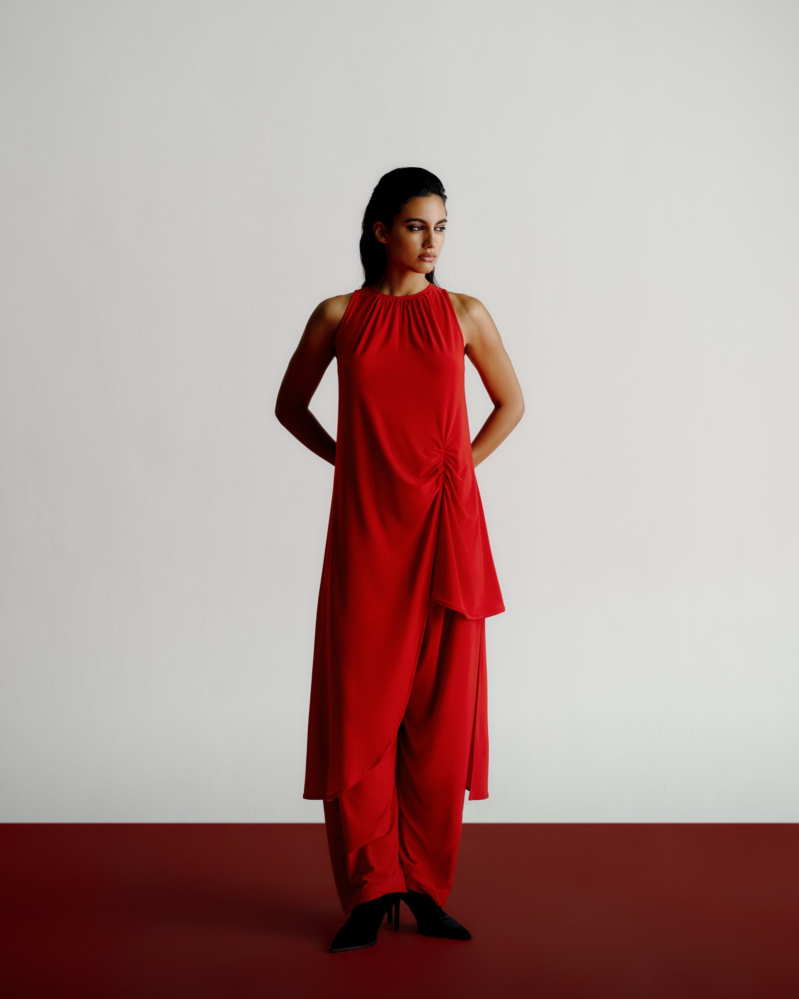 The Lana Kurta Set reimagines minimalism with a sculptural sensibility. Cut in jersey, the tunic features a halter neckline and an asymmetric drape that gathers softly at the waist, creating a natural wrap effect. The elongated silhouette falls gracefully over relaxed trousers, balancing fluid movement with refined structure.