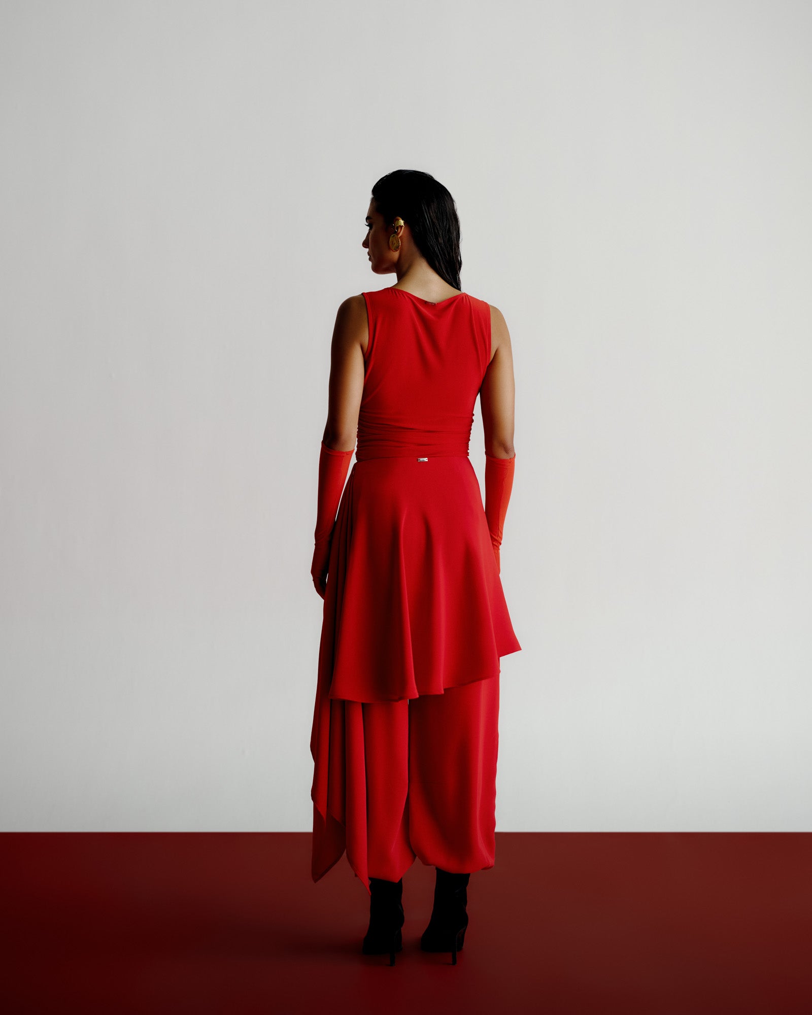 This effortless sleeveless t-shirt from 431-88 is designed for the modern woman who embraces bold elegance. Crafted with fluid draping and a sculpting fit, this statement piece blends contemporary minimalism with high-fashion cut. The ruched detailing on the waist adds movement and depth, creating a sculptural silhouette that effortlessly flatters. Styled with sleek extended gloves for a dramatic touch, this piece transitions seamlessly from couture evenings to elevated event dressing.