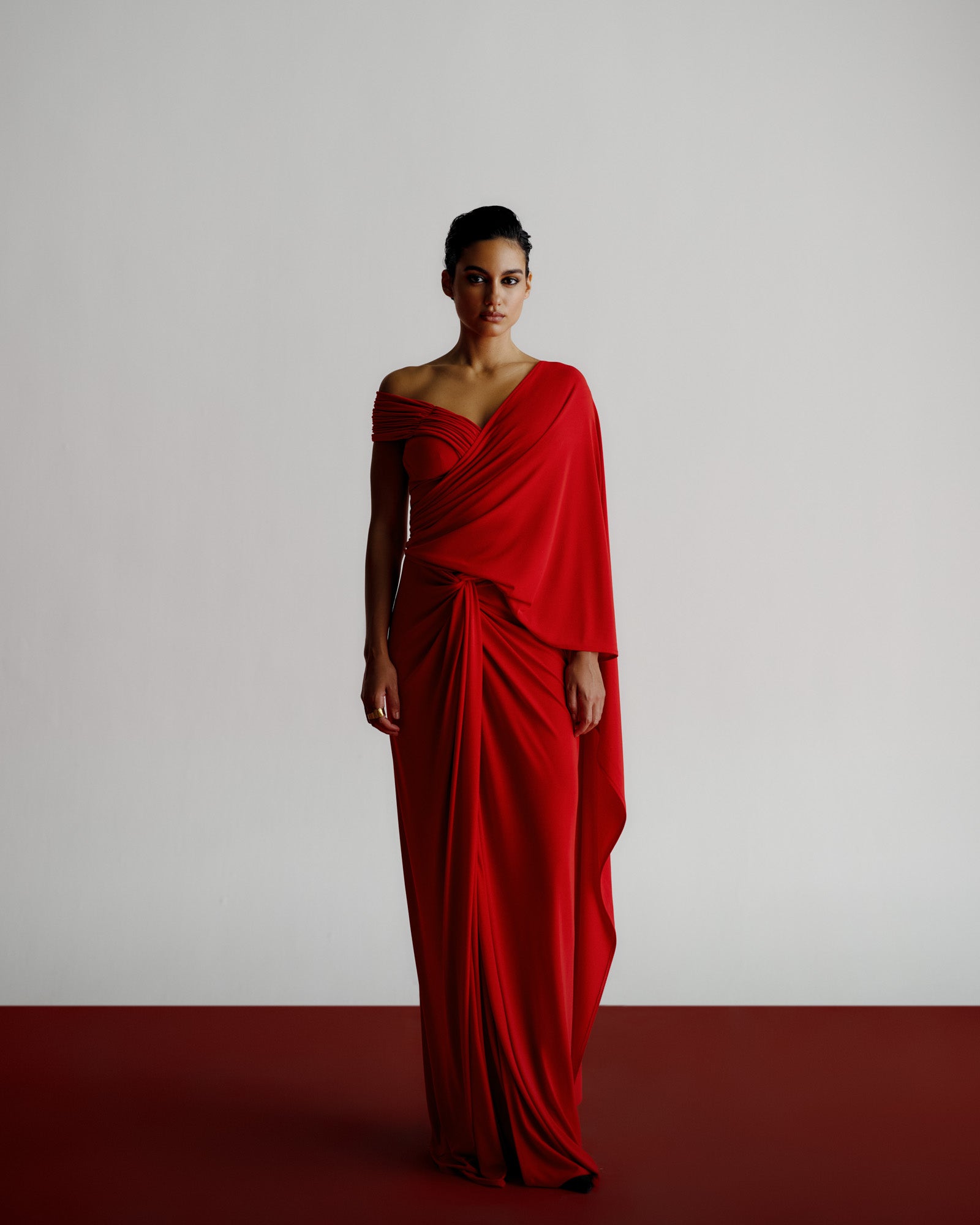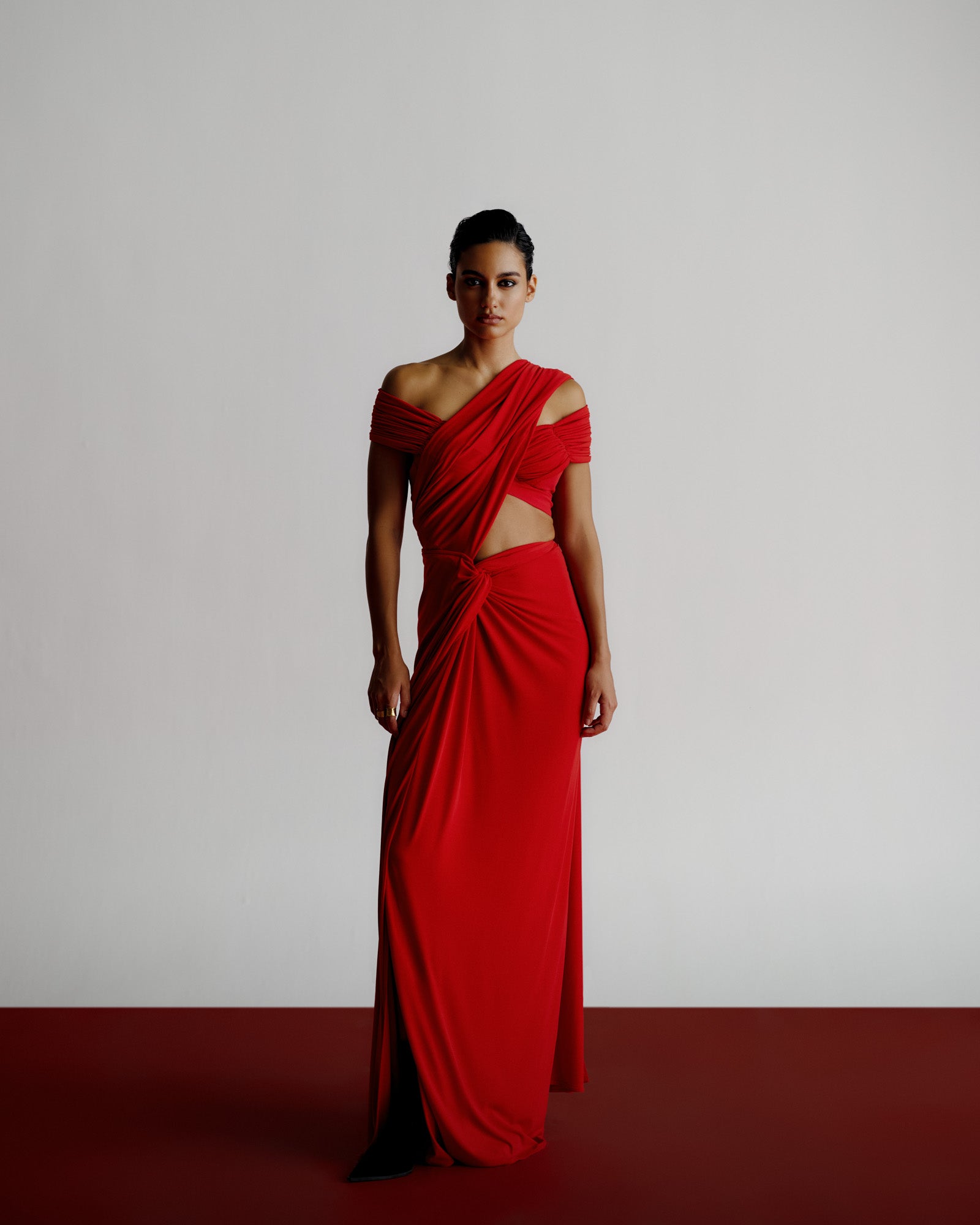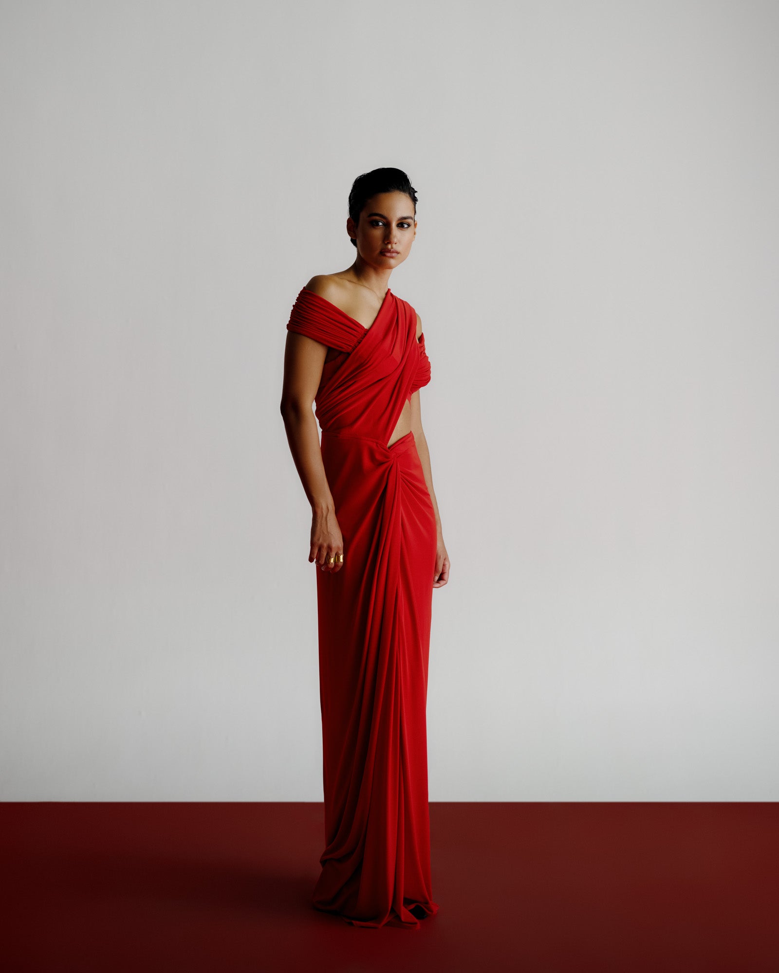 The Knot Sari embodies effortless modern glamour. Crafted in fluid stretch jersey, this contemporary interpretation of the sari blends movement and structure with signature precision draping. The asymmetrical Knot detail on the waist creates a bold, sculptural line, while the fabric’s natural sheen enhances its luxurious depth and flow.
