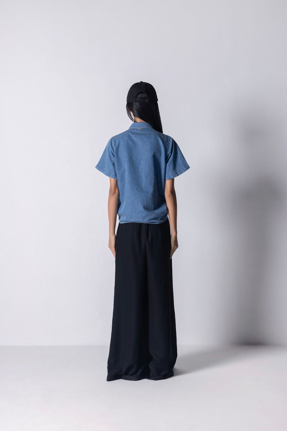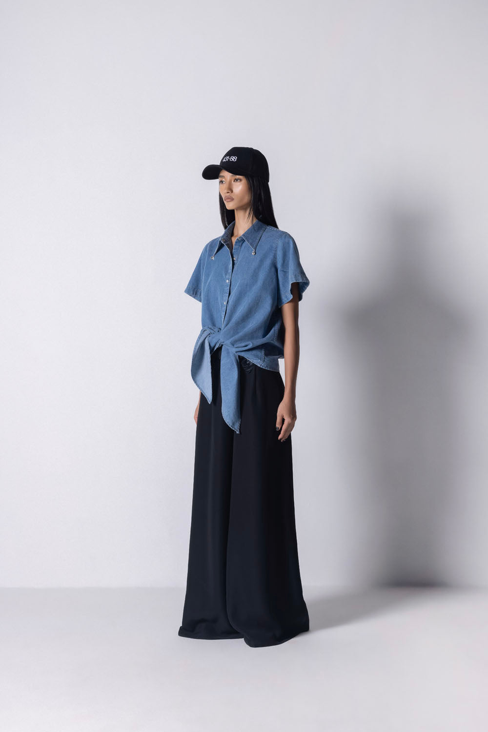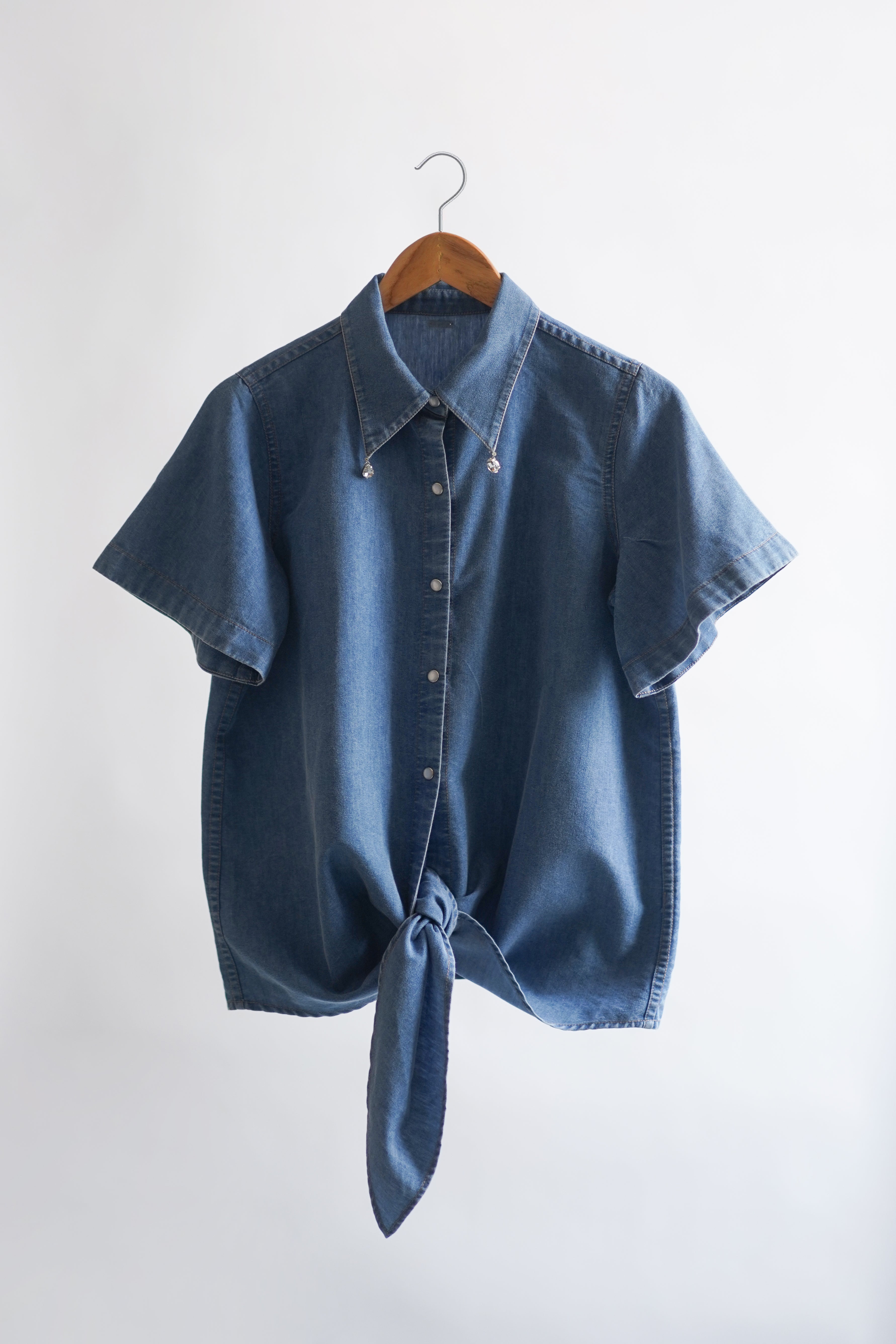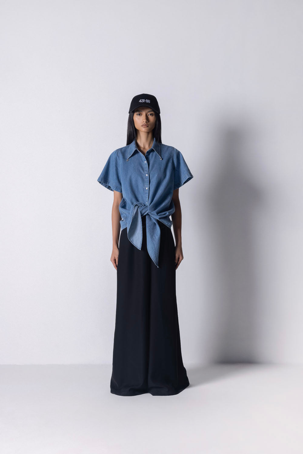 The AK Denim Shirt has a boxy fit with a tie front detail that accentuates your waist. The collar has been enhanced with a delicate crystal embroidery to give it that subtle glam.