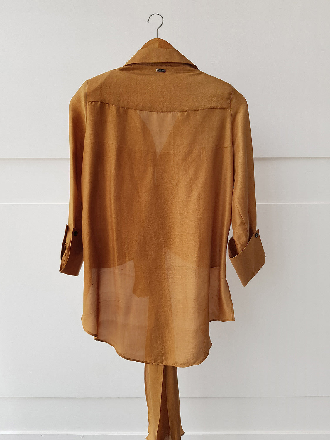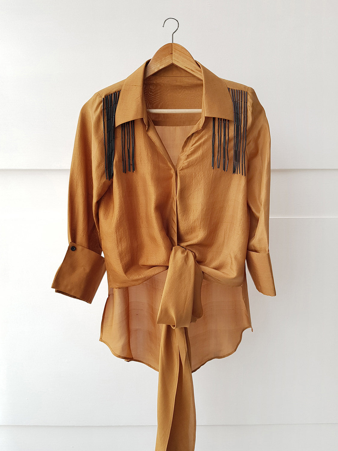 The Kay Shirt is a high-low shirt with a long back and a short front that wraps around the body and ties up in front. Hand embroidered tassel beads from the shoulder give it the right amount of movement.