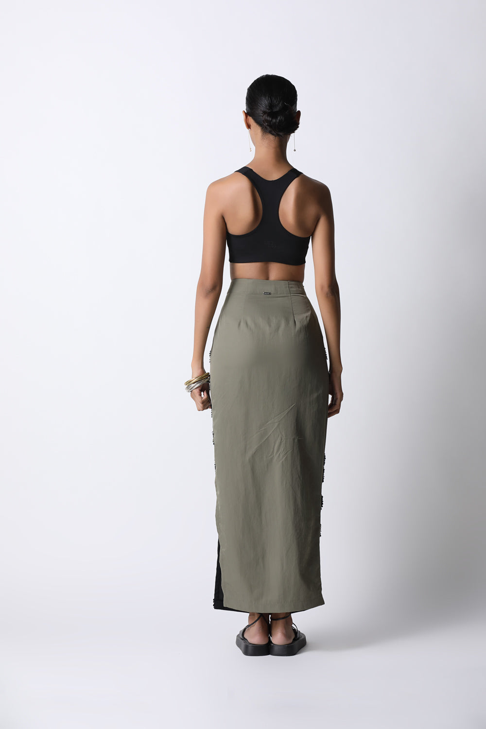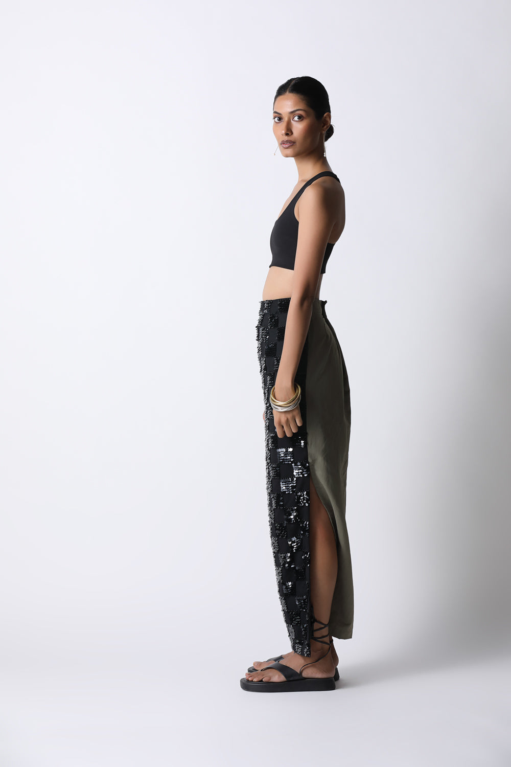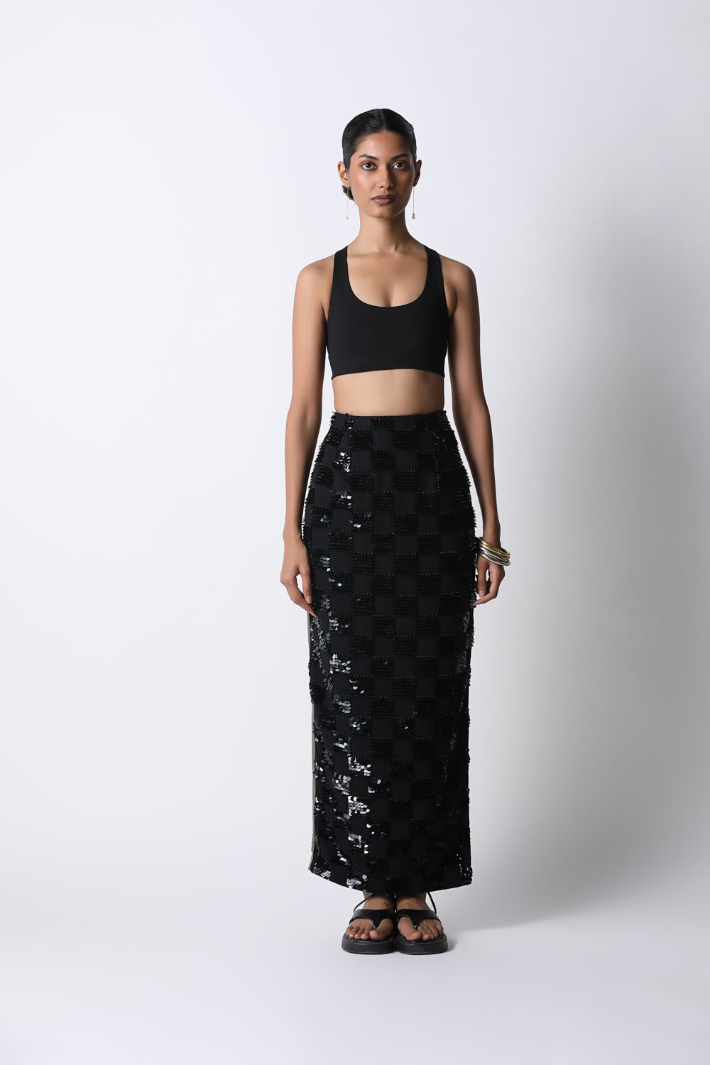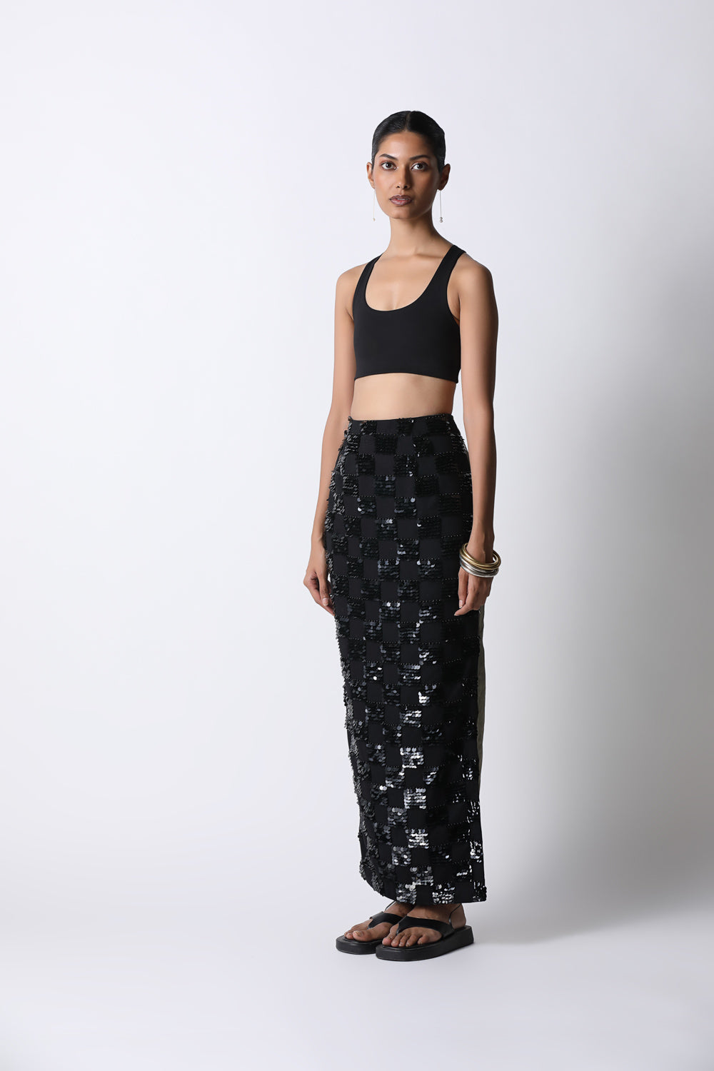 The Chess Pencil Skirt is cut in a straight pencil fit and is enhanced with hand embroidered sequins to resemble a chequered pattern in the front. The skirt has a surprise colour block at the back. It closes on the side with a concealed zip and has a slit on one side.