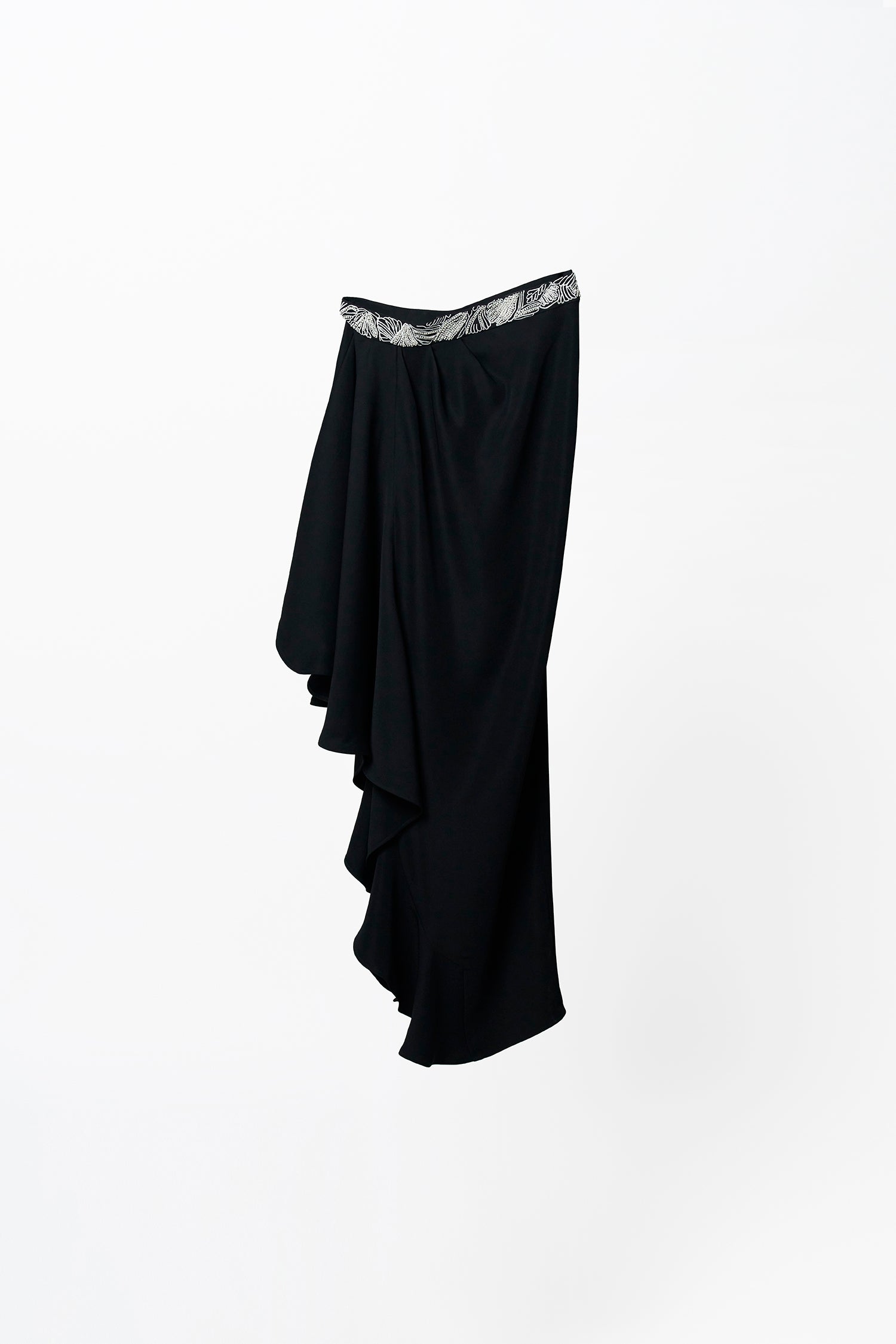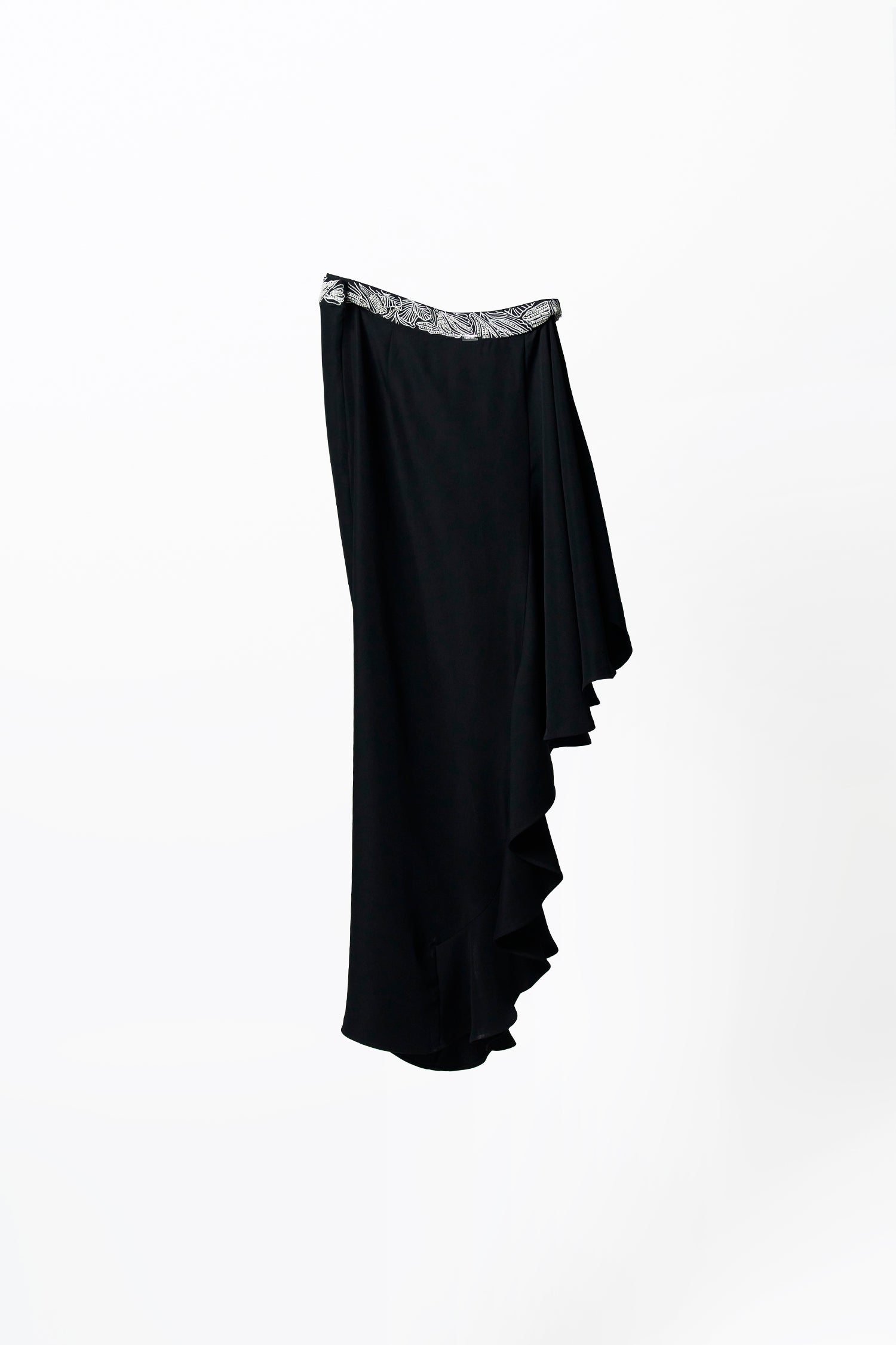 Fiona Skirt is a high-waist skirt made of suiting fabric with a machine embroidered waistband & hand embroidered highlights with an asymmetric hem. Pleats on the waistband fall flawlessly towards the hem in an asymmetric pattern.