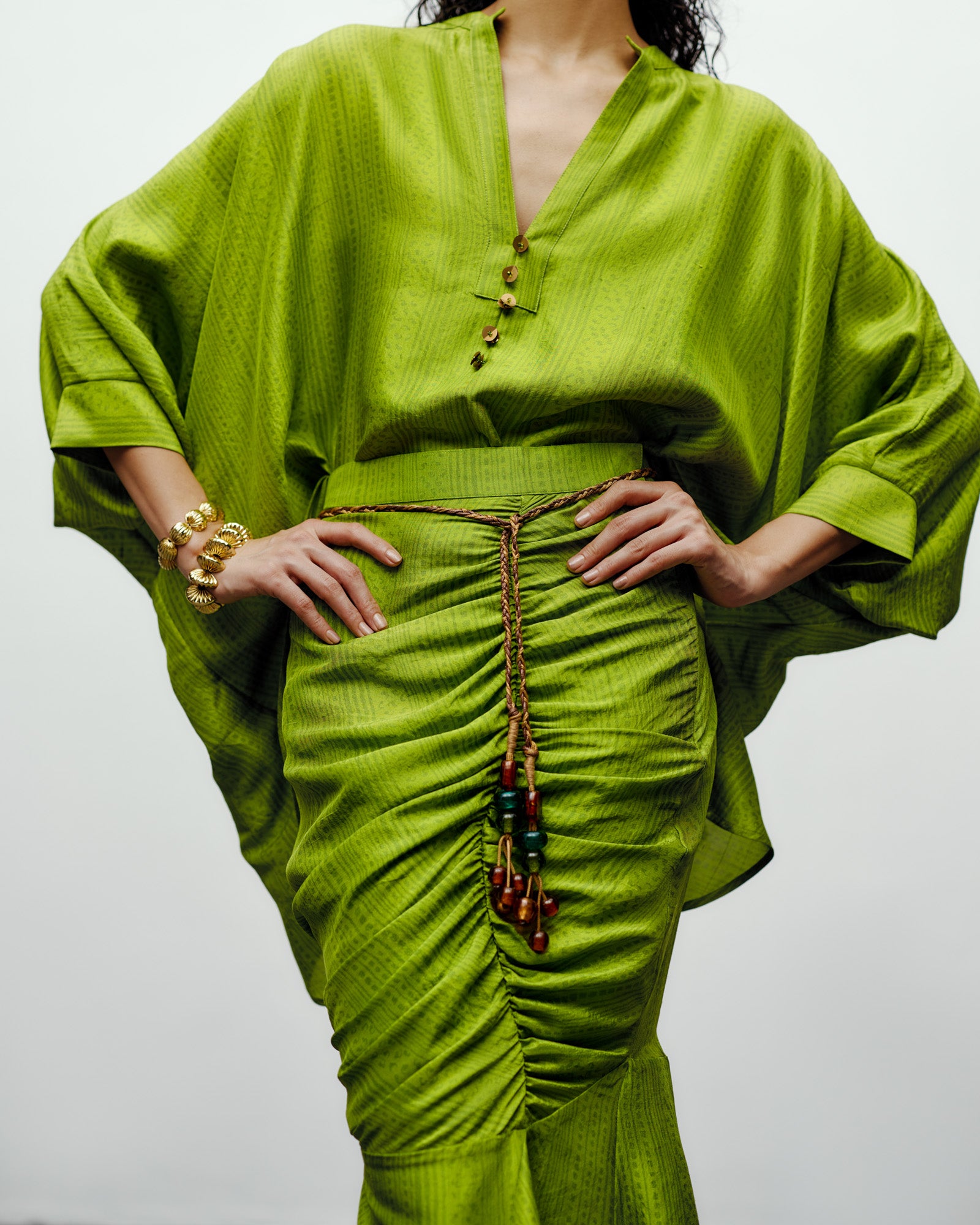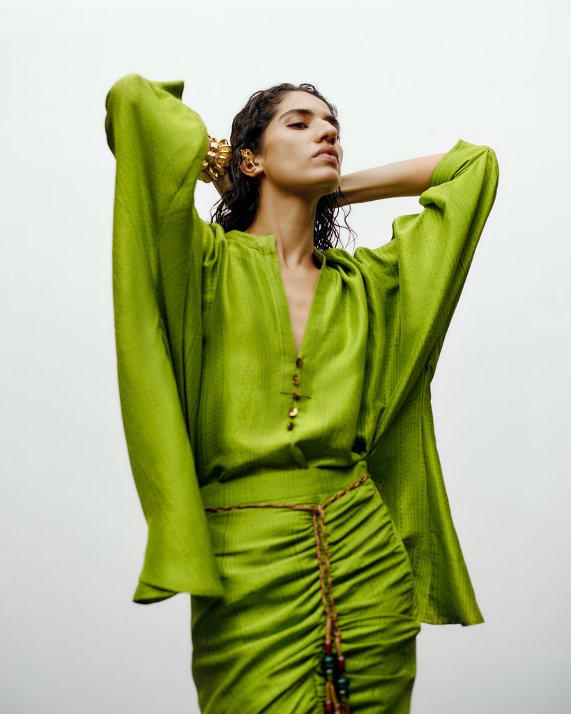 The Heather Skirt in lime green is a contemporary reinterpretation of classic draping with a modern edge. Crafted in a lustrous silk fabric which has a subtle print, the skirt features meticulous ruching along the front that accentuates the form while creating fluid movement. The asymmetric hemline adds a sculptural touch, and the handcrafted cord belt with statement bead detailing lends a refined, artisanal finish. Designed for versatility, this skirt pairs effortlessly with structured tops or relaxed drapes, embodying 431-88’s signature fusion of sensuality and ease.