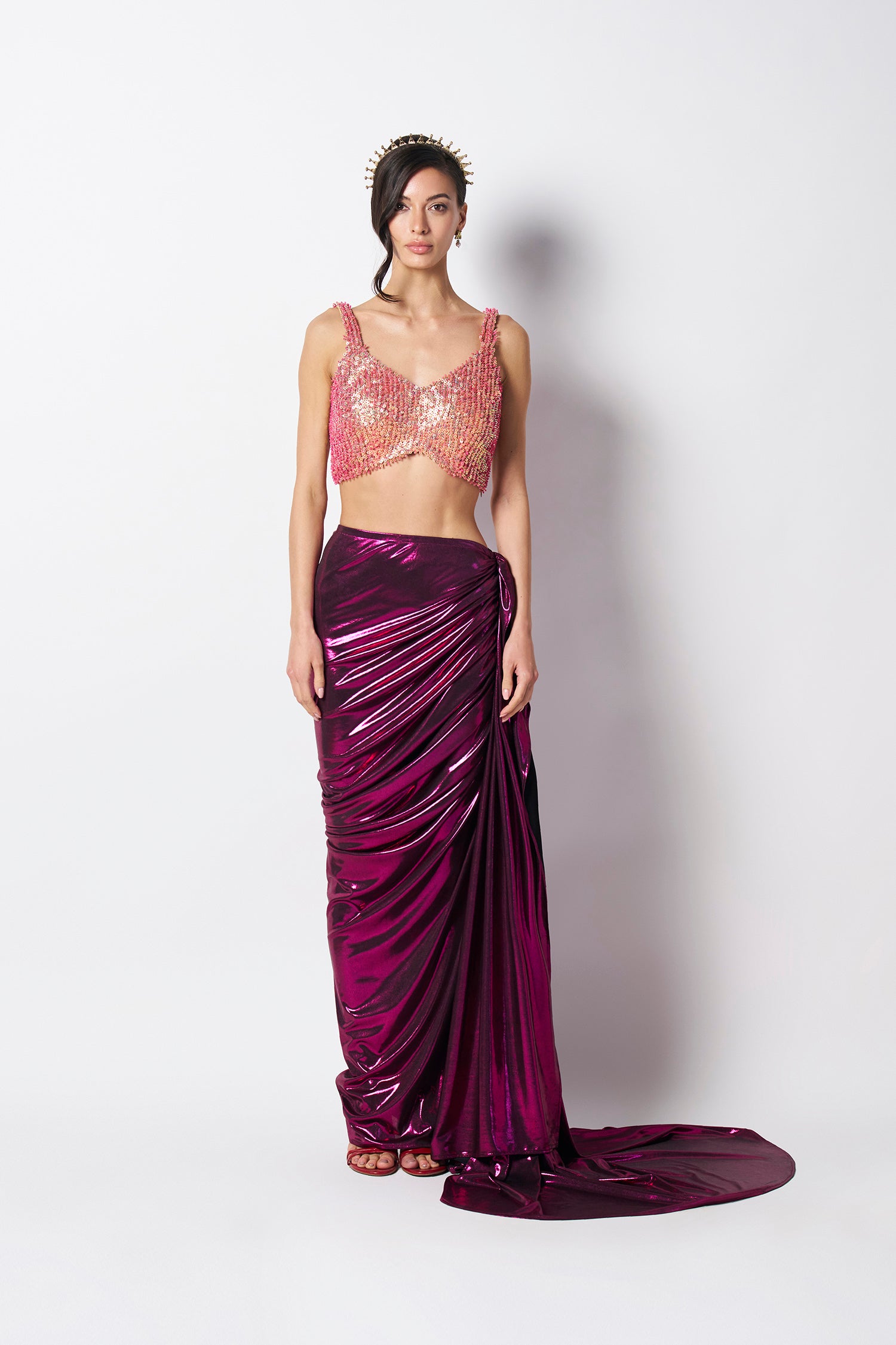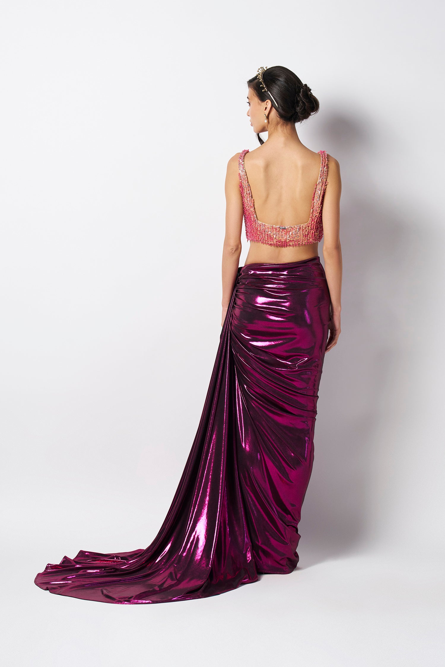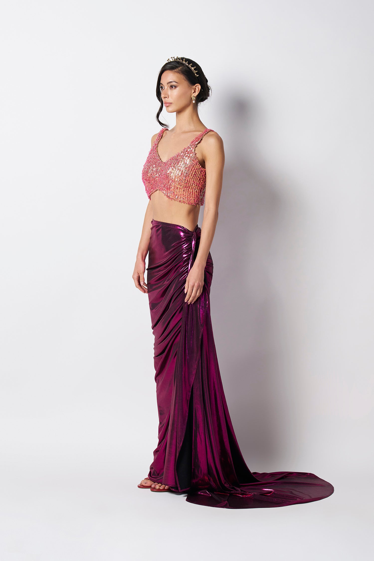 Experience timeless elegance in the Kaai Skirt, skillfully fashioned from luxurious liquid jersey fabric, creating an exquisite drape that gracefully drapes around the body.The skirt has side slit with an asymmetric waistband and trail. The high side slit lets you to move with grace. Pair it with our cape and blouse.