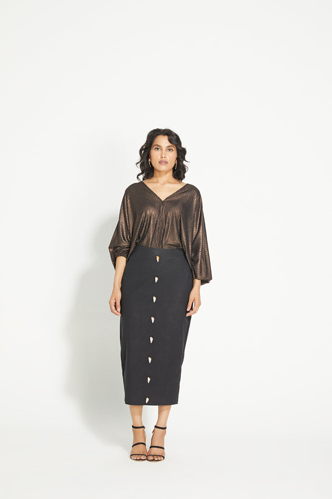 The Lucy Skirt is a straight fit pencil skirt made in a faux leather with embellished crystals along the front. It comes in a calf length and closes at the back with a zip.