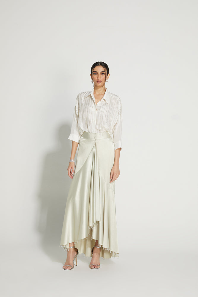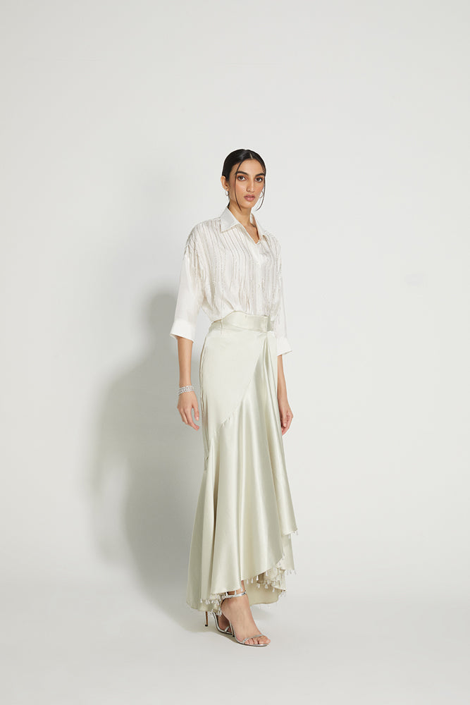 The Raindrop Skirt is draped that flares at the bottom with a shorter front and a longer back. Wraps around the waist and closes with a hook. The hem is hand embellished with drop crystals. Cut from a satin, the sheen of the fabric makes it a great option as a lighter lehenga.