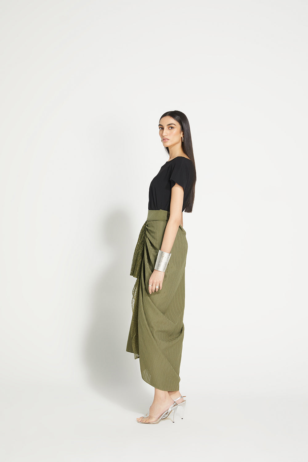 A straight fit skirt that is draped in a way that gives a flattering look to the body. The Tribe Skirt plays with fabric textures with a front net drape and a leather waistband. Closes on the side with a concealed zip.