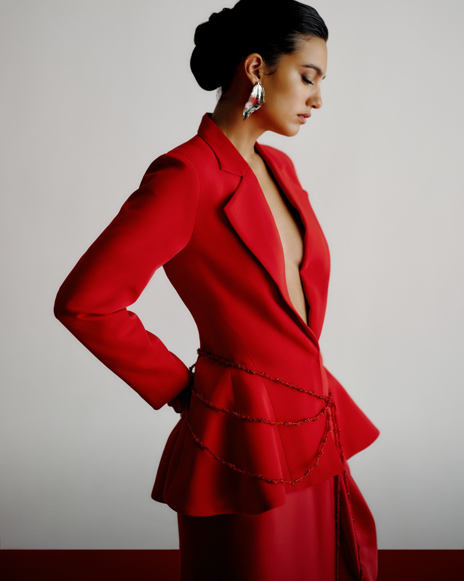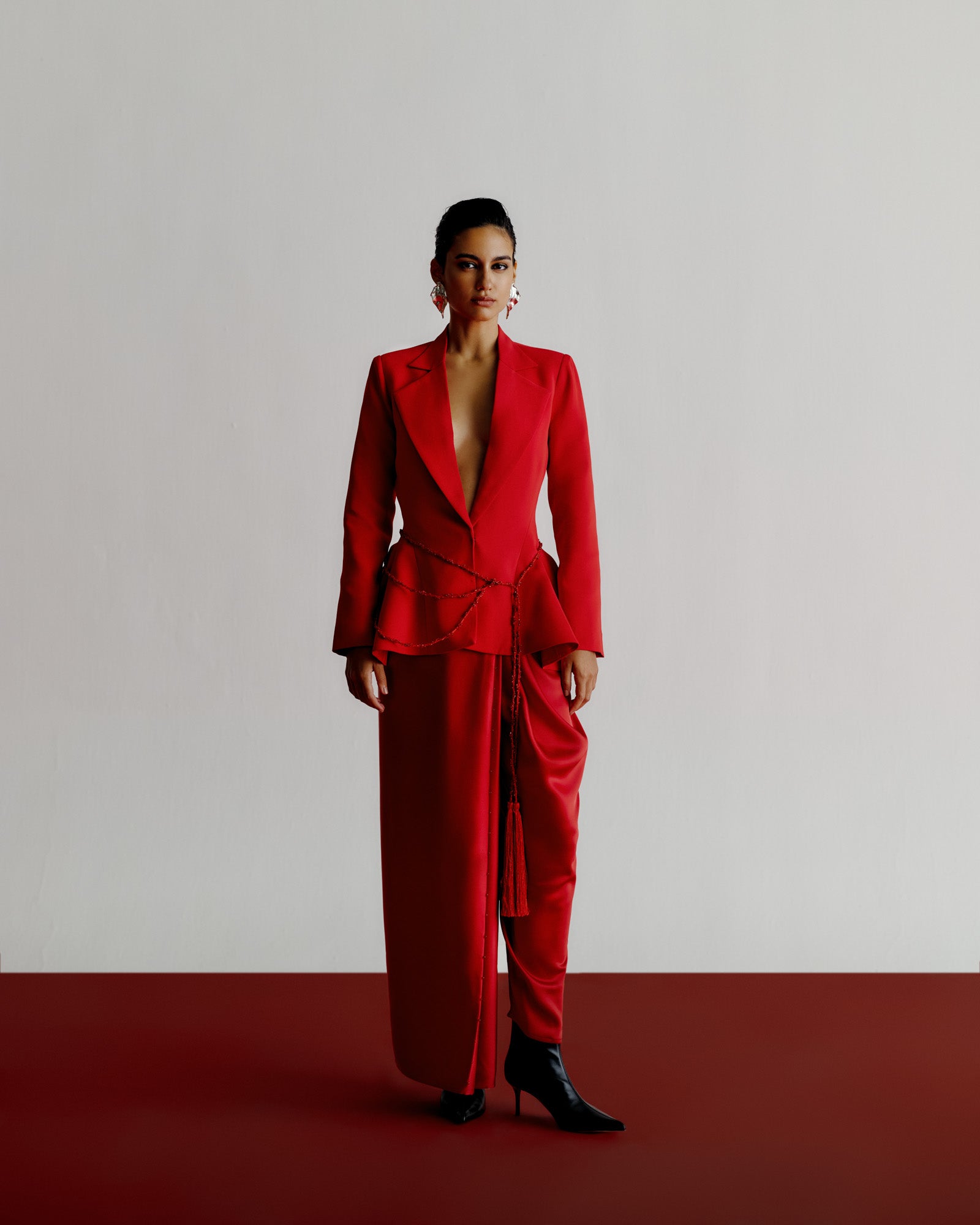 Timeless essential reimagined through the lens of 431-88, the Beaded Dhoti Pants blend structured tailoring with fluid movement. Crafted from luxurious satin, these pants feature a draped front panel that creates an elongated silhouette, offering both sophistication and ease. The design is elevated with delicate Red bead embellishments that trace the edge of the drape. The high-waisted fit enhances the body’s natural lines, while the relaxed leg ensures effortless comfort and poise. Perfect for statement evenings or refined daywear, this piece embodies the essence of 431-88’s understated glamour.