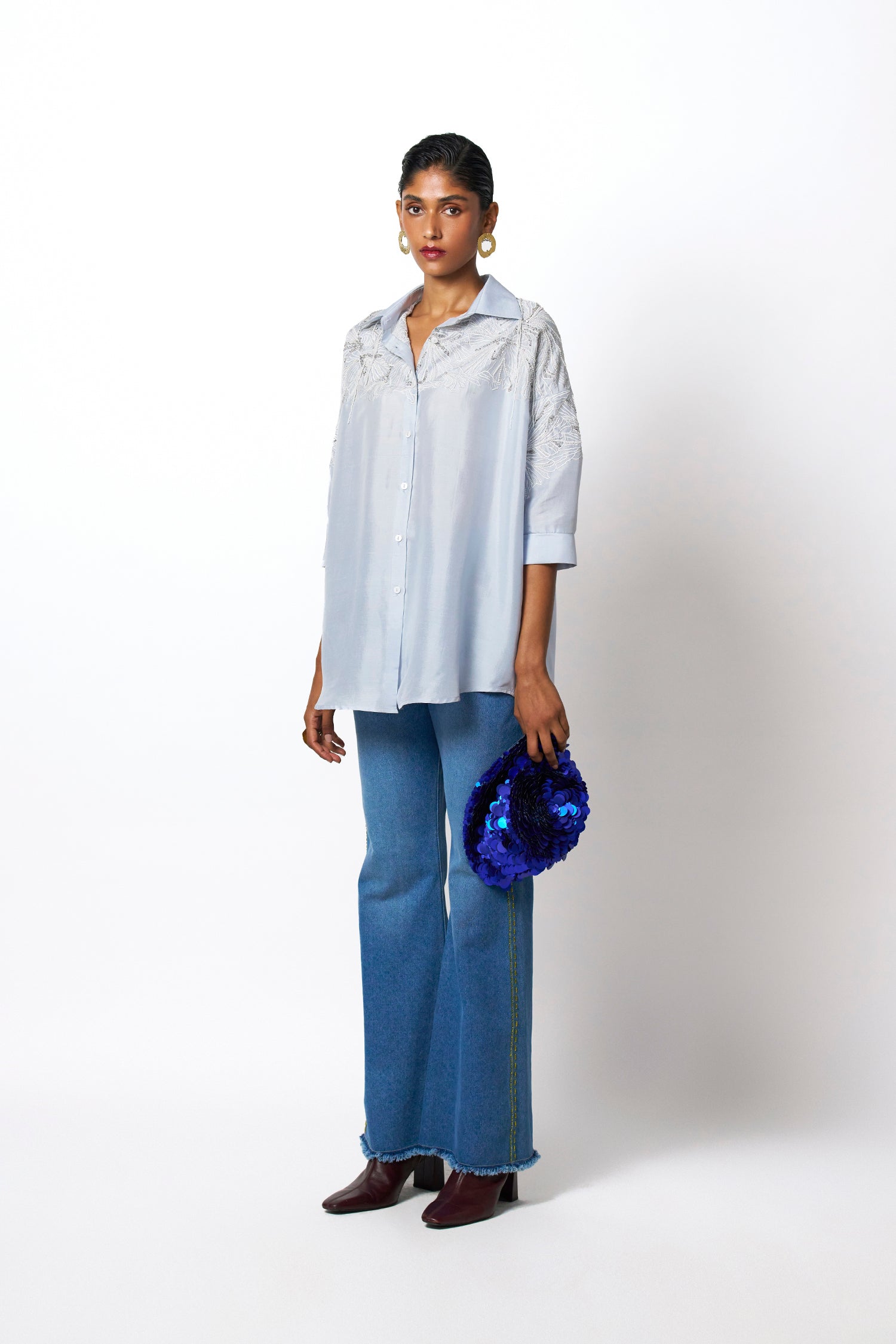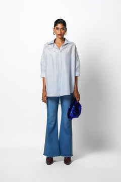The Clutch Pant is a 5-pocket jean crafted from cotton denim . It features delicate hand embroidery along the side seam, a high waist, and a bootcut leg. Designed with a zip fly and button closure, these jeans offer a regular length that grazes the top of the foot with minimal or no stacking. A timeless silhouette that remains a staple season after season.