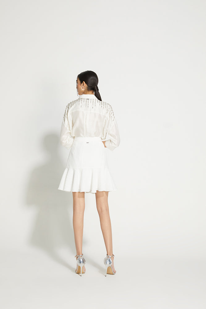 Our Coco Skirt features a knot twist detail at the waist. This mini Skirt flares out with a ruffled hem. Closes on the side with a concealed zip. The texture of the fabric adds fun to the silhoutte. Wear it with your favourite white shirt for a coordinated day look.