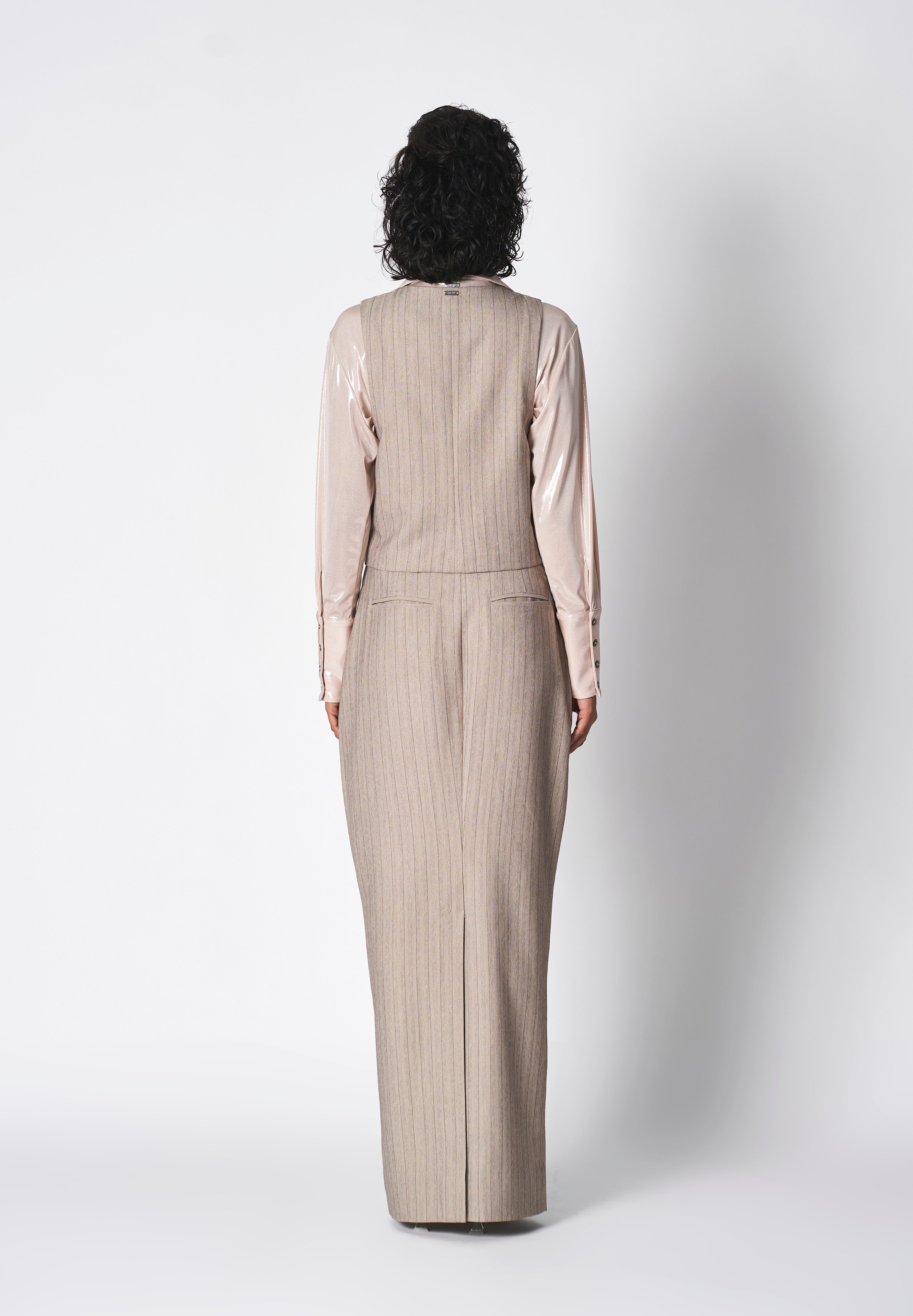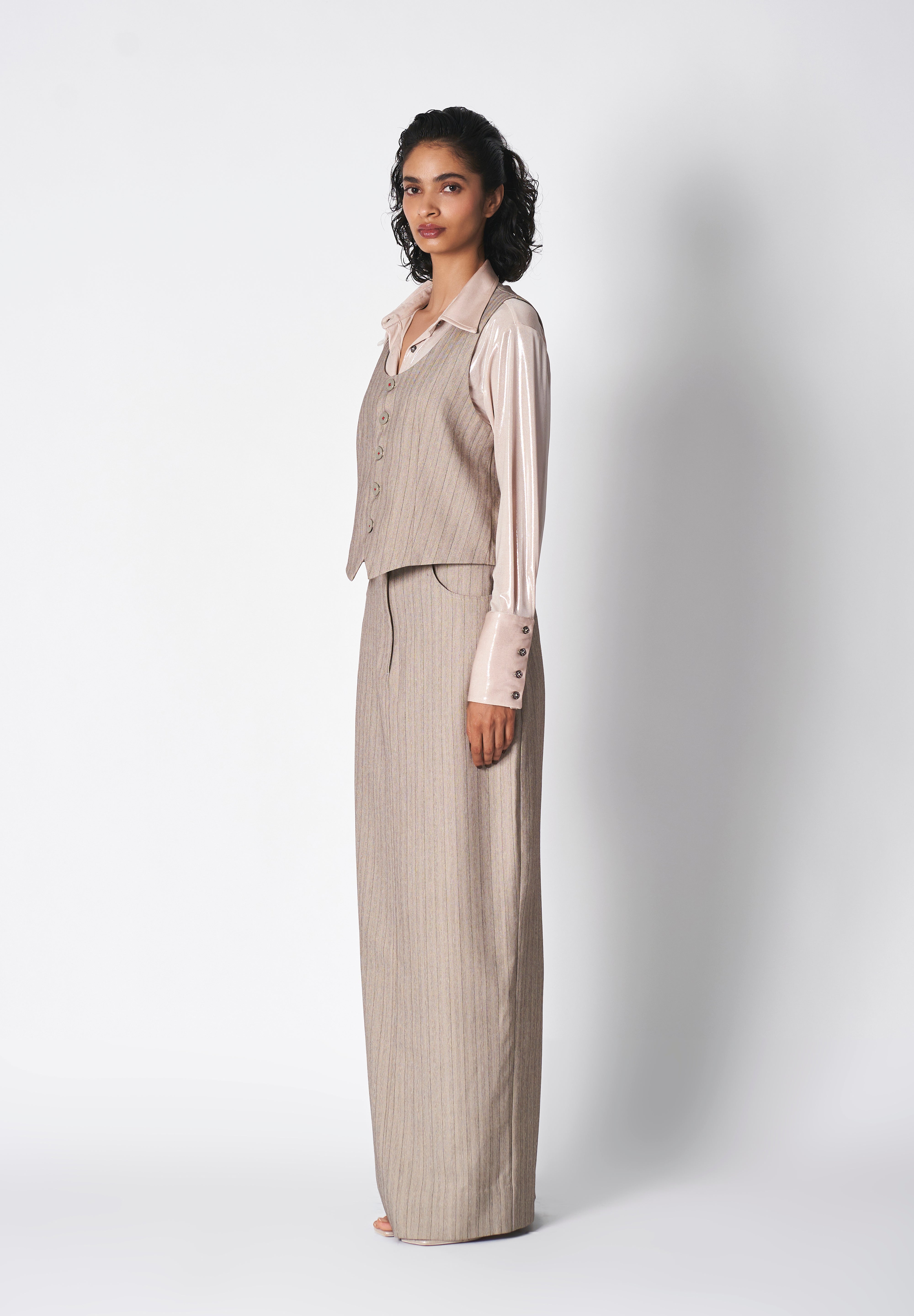 The Corp Skirt is an exceptionally sublime workwear essential. It is cut in a comfortable suiting fabric. Tailored with an asymmetrical waistband with a buttoned closure and jet piece. Wear our office shirt for your next pitch meeting to show them you mean business.