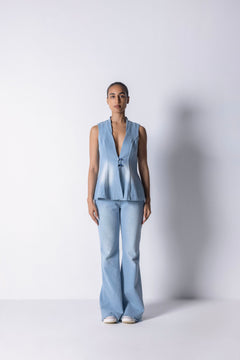 The perfect blazer for the day. The Denim Blazer is a tailored sleeveless blazer with a flared peplum bottom. It has a thin round collar and a deep neckline and closes in the front with loops and maxi crystal buttons. Can be worn over your shirts as well.