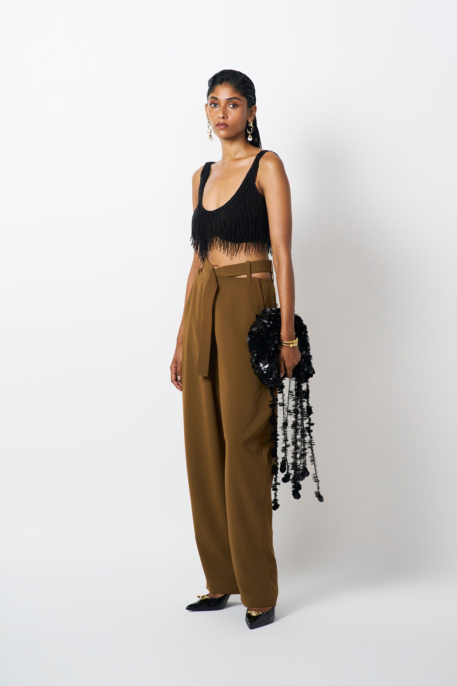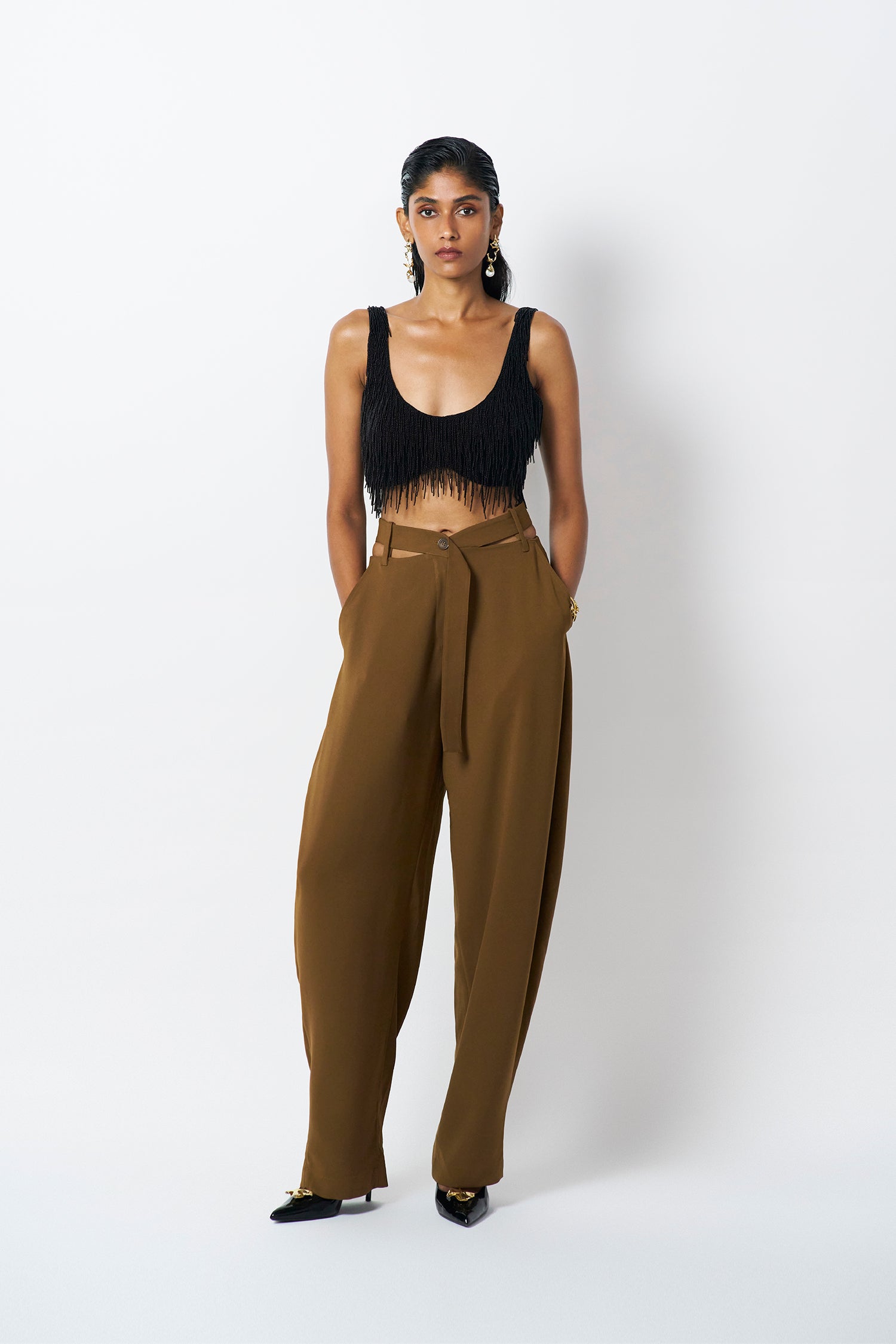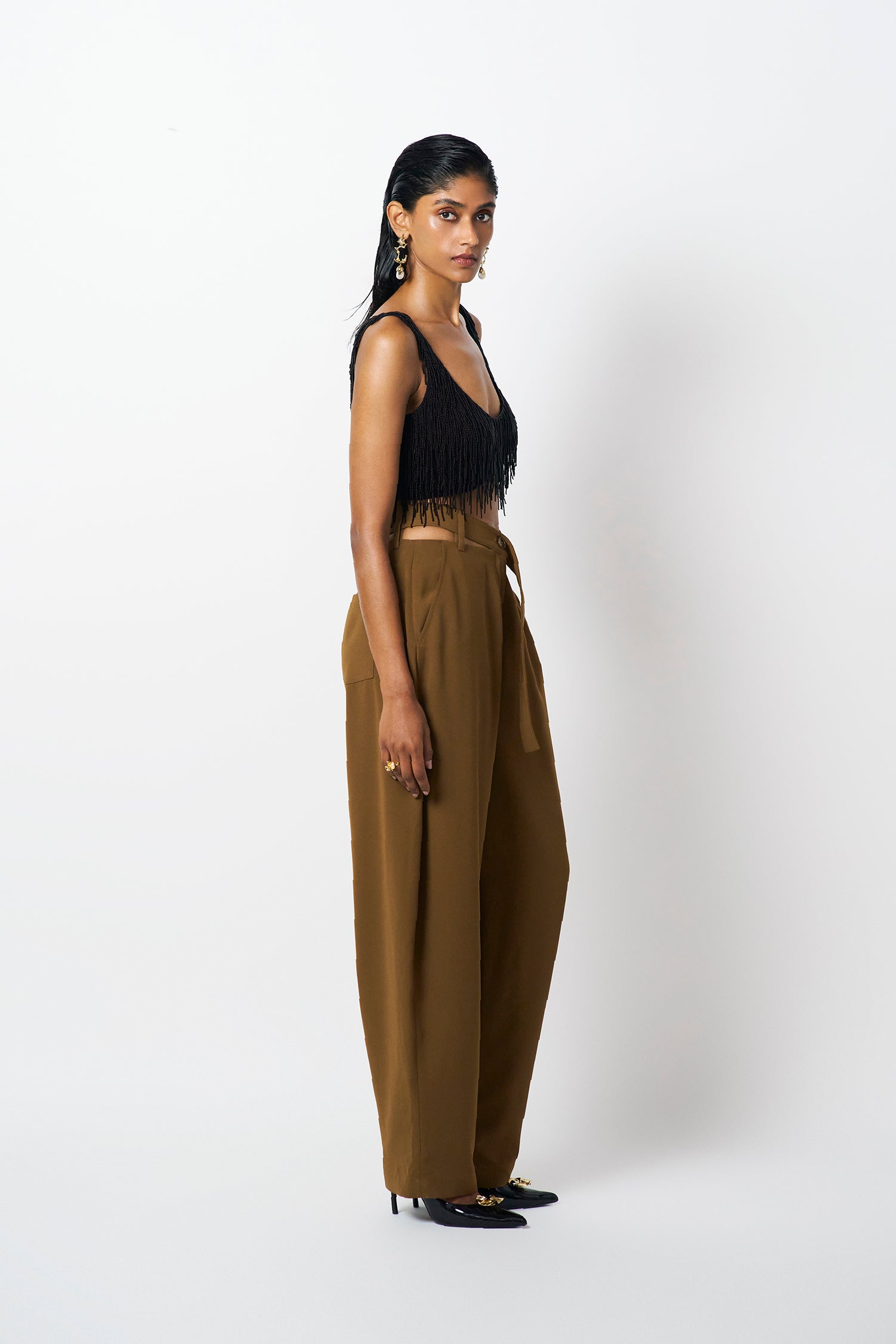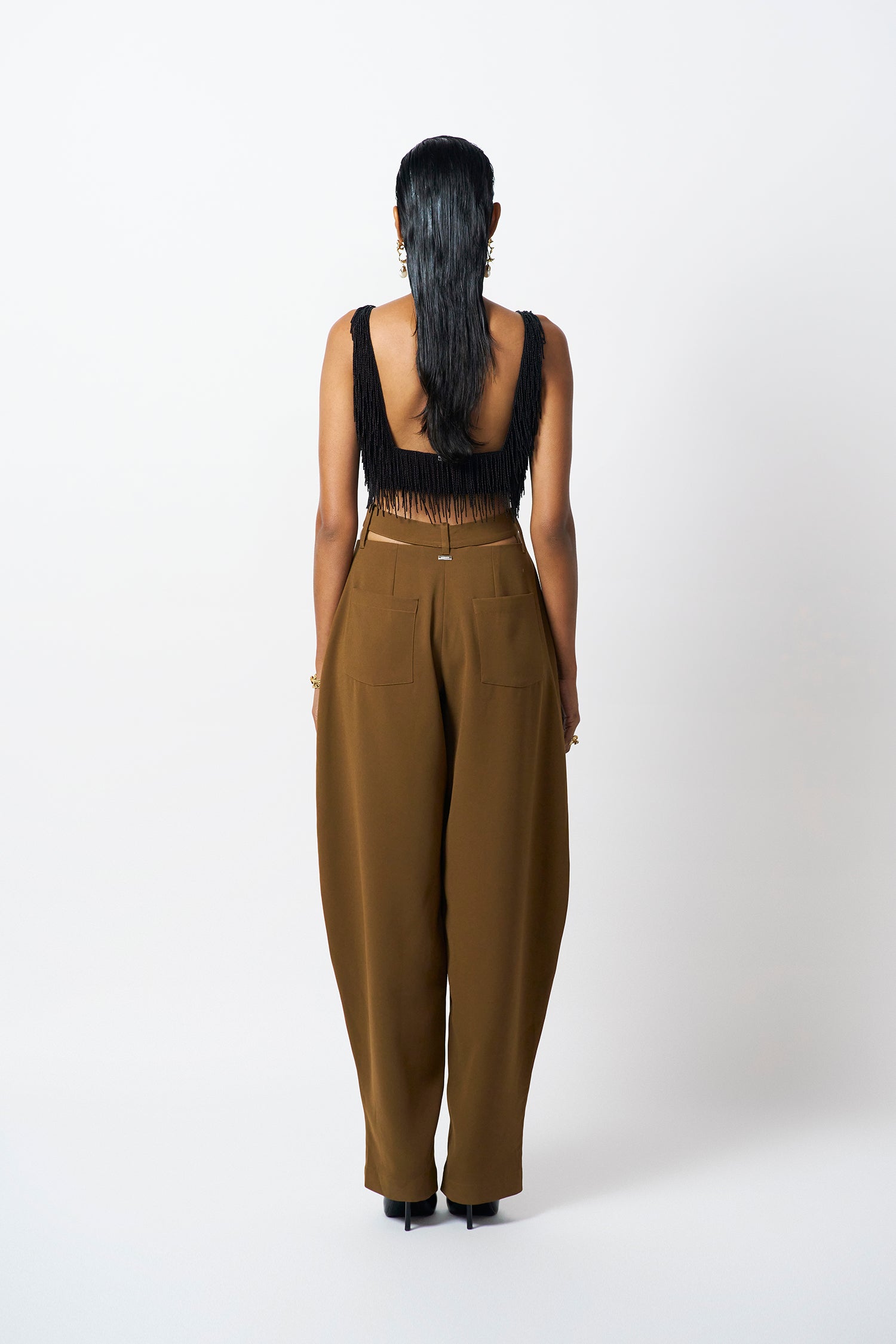 The Espresso Pants are a chic and stylish addition to your wardrobe, designed in a relaxed fit for effortless elegance. Crafted from luxurious suiting fabric, these pants feature a unique waistband detail that highlight your skin, adding a flattering touch to a classic silhouette. Perfect for versatile styling, pair them with a casual t-shirt or one of our bestselling shirts.