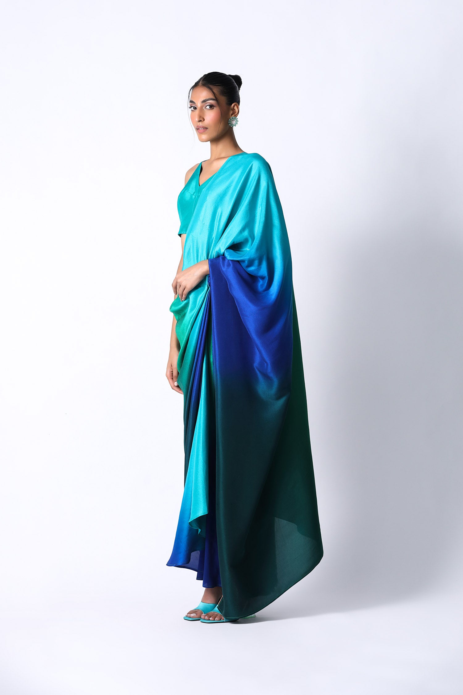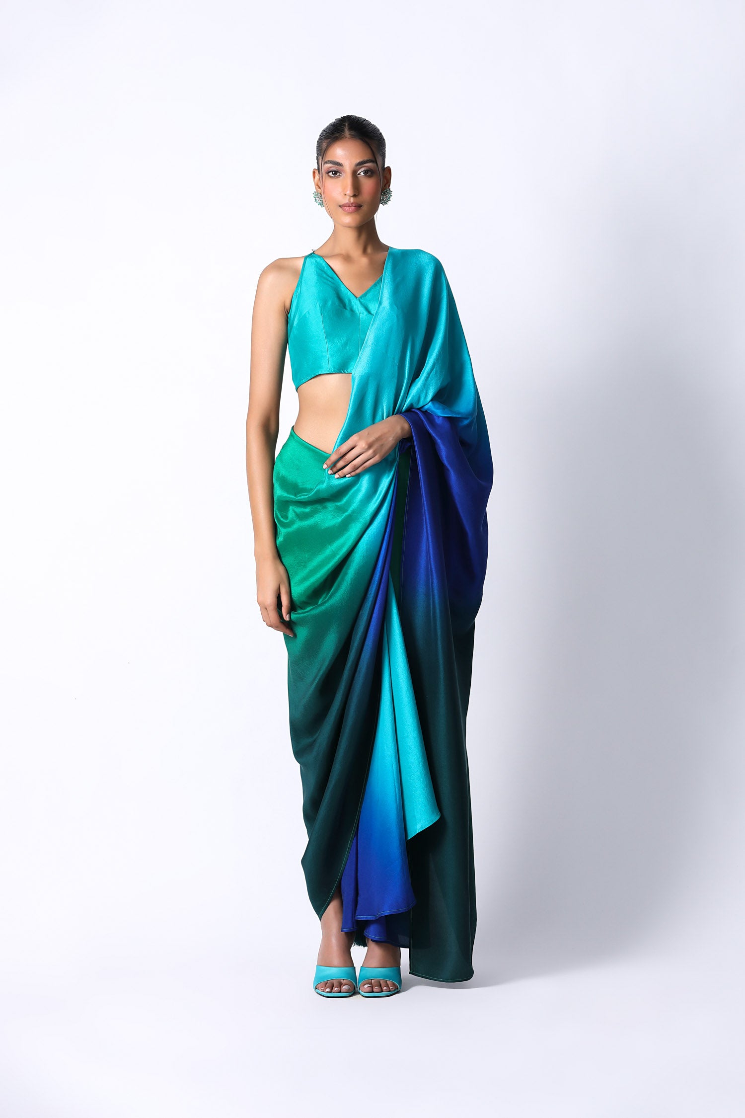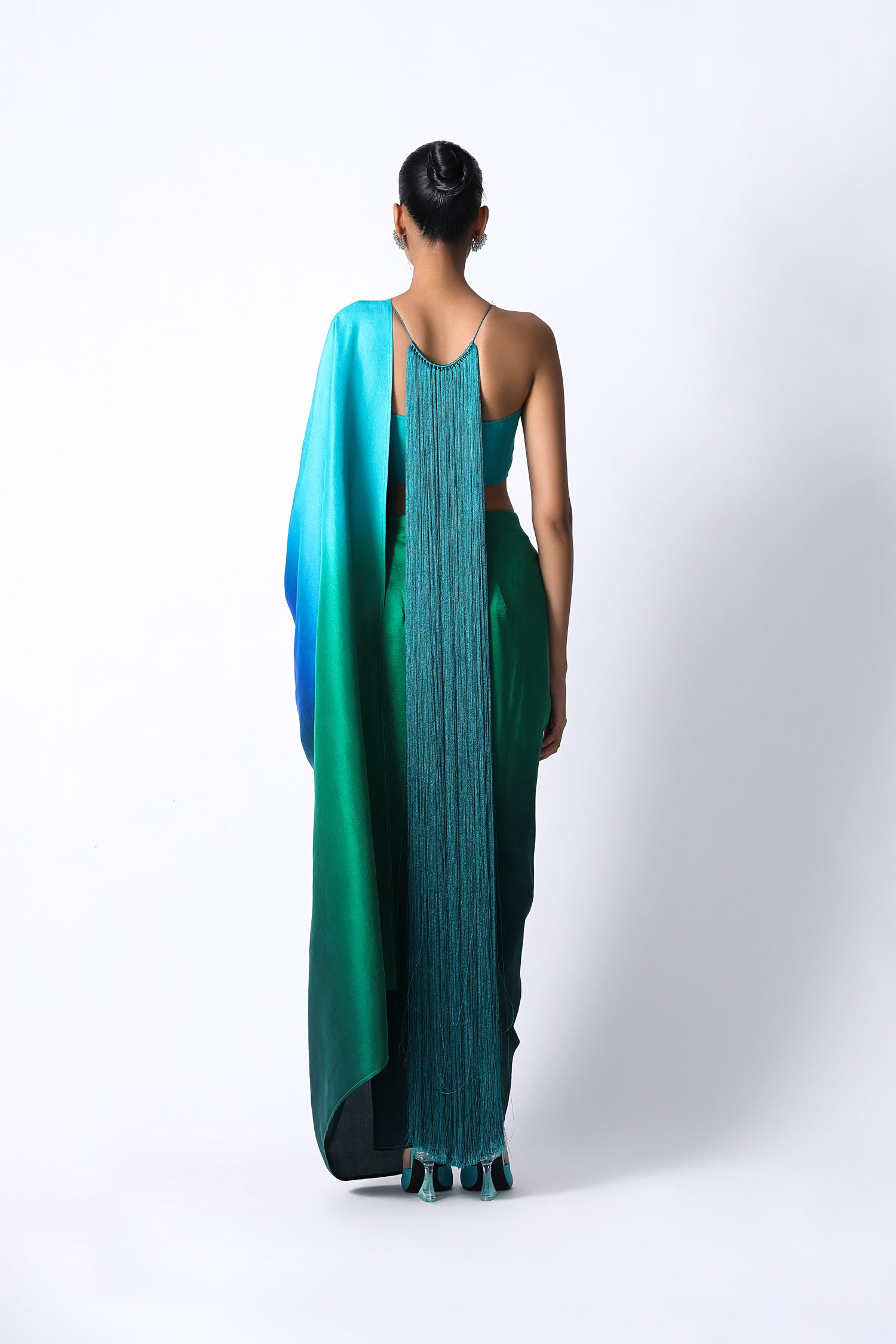 The classic Masai Godet Sari gets a new look with a 4 way ombré treatment. With a built in petticoat, the pallu gets attached to the waist with the clever use of a snap button and stays on while you are on the move. Pair it with the new Fringe Pallu Blouse that has a halter neck and closes on the side with a zip. The back features a long fringe that looks like a cape