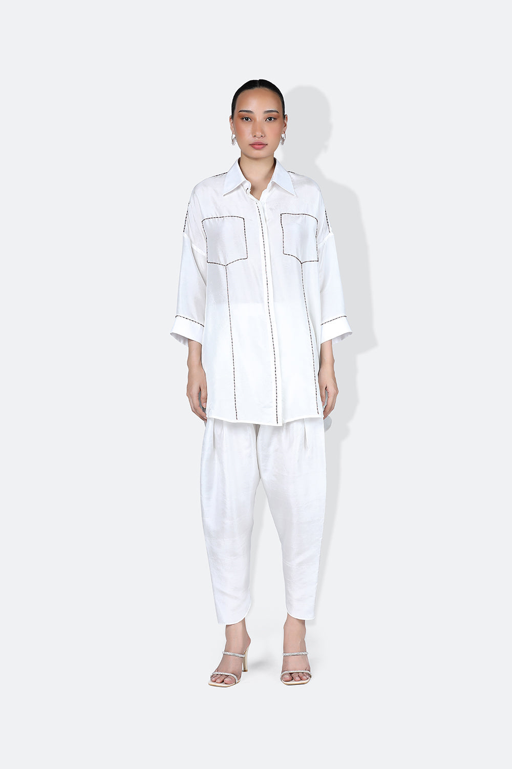 The Lola Shirt is a easy to wear classic detailed with special embroidery of mock pocket and princess seam and shoulder line , the shirt is a mid thigh length and has 3/4th sleeves . Its the seasonless staple essential for your wardrobe .