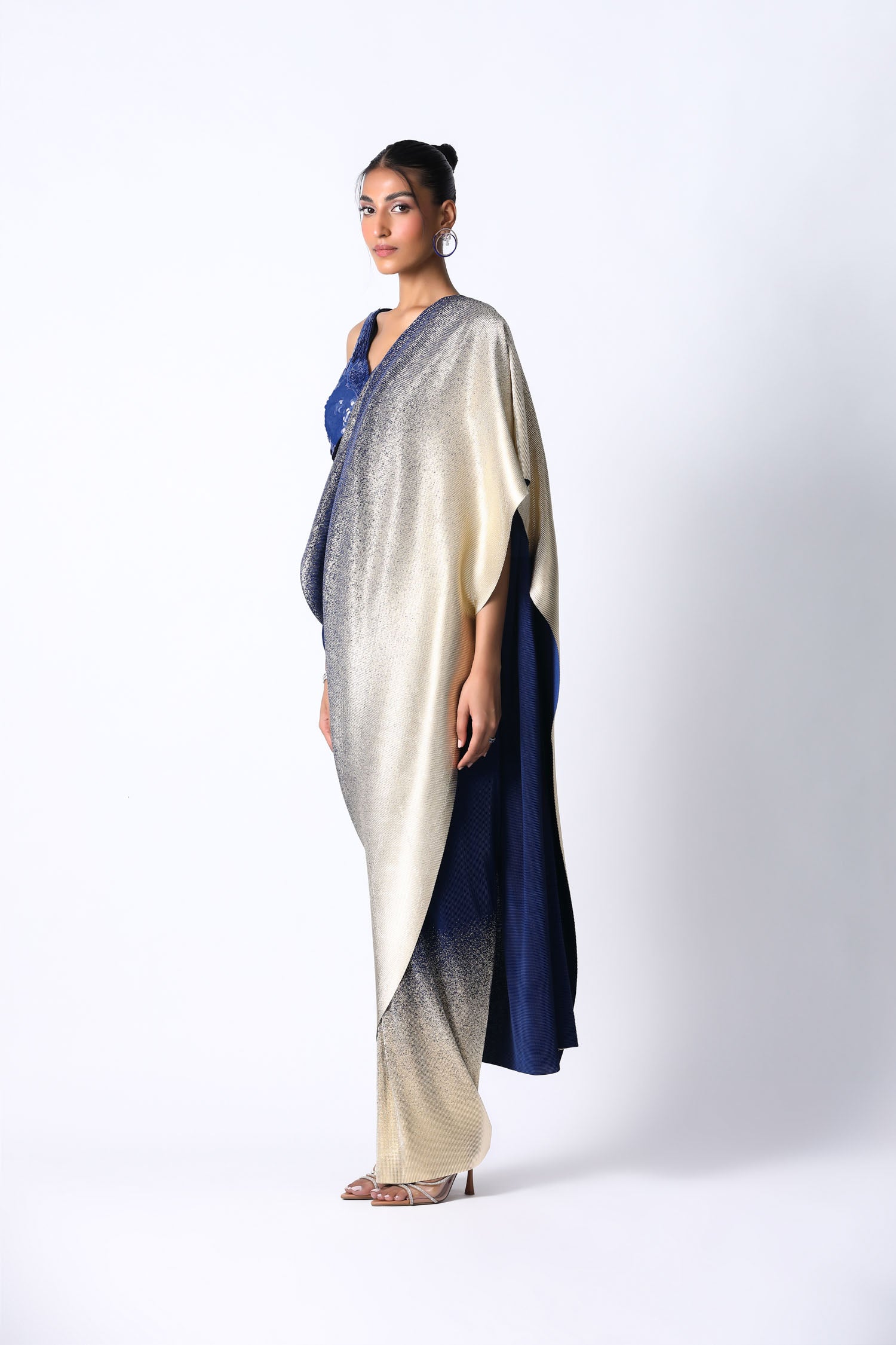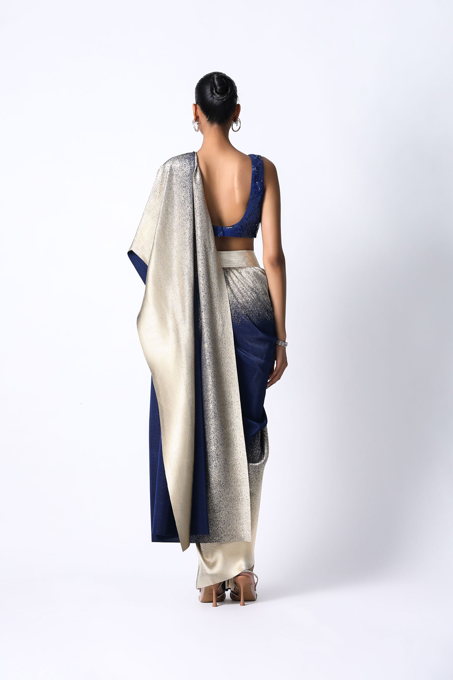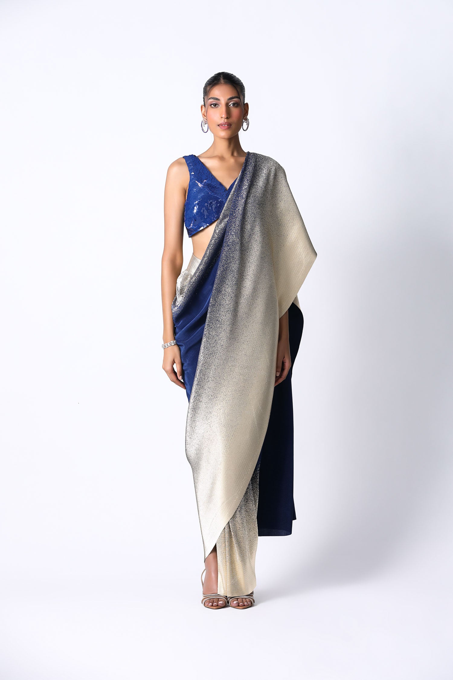 Our Midnight Sari made in our pleated metallic with an ombré foil detail is perfect for your upcoming festivities. Lightweight and easy to wear, it is pre-draped with an attached petticoat. Wear it with our new May Blouse that is embroidered with sequins and glass beads which has a deep V neck and a curved shaped hem.