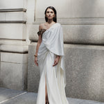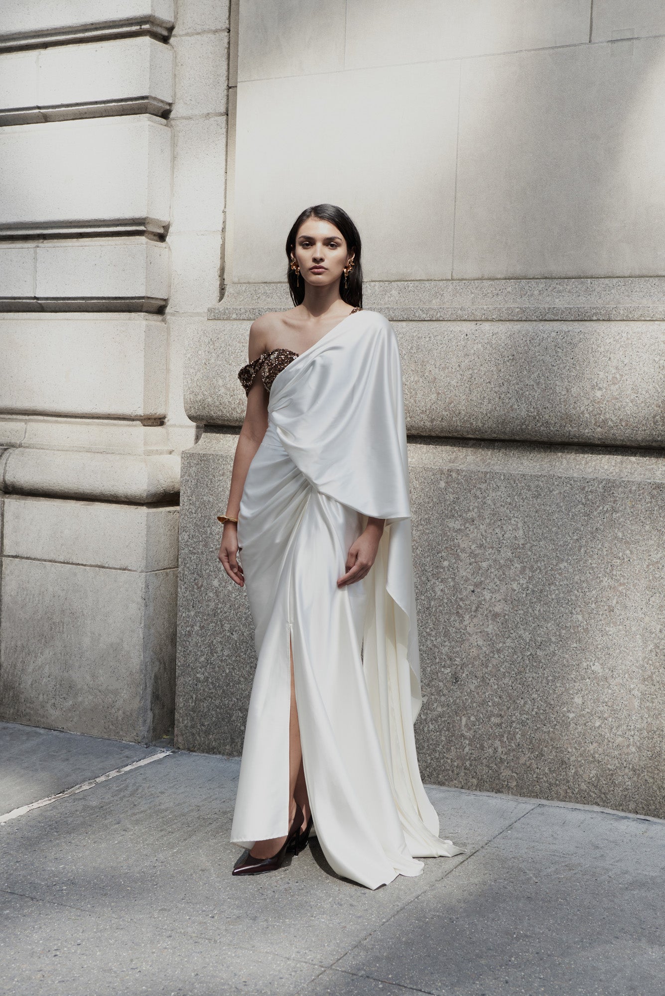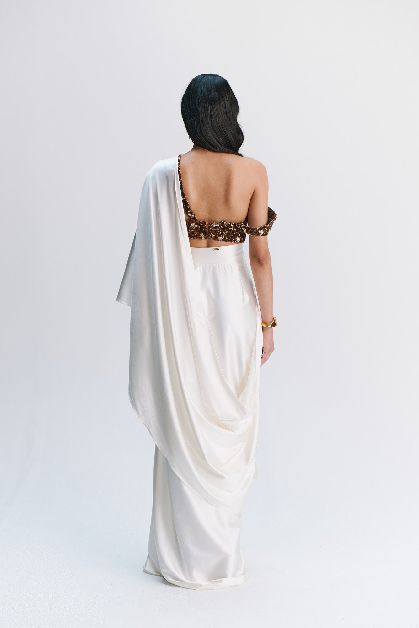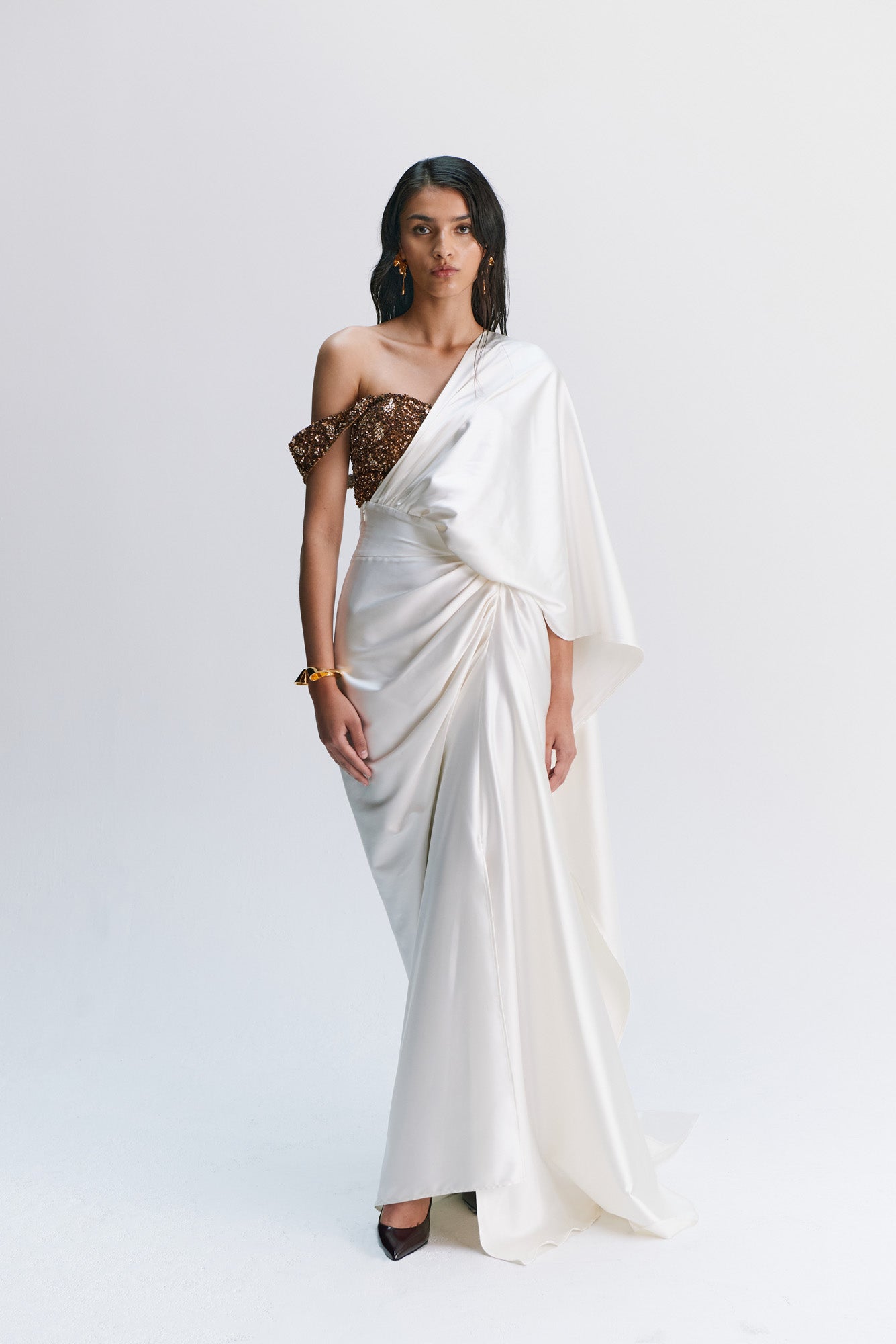 The Mish Set is an iconic 431-88 pairing: a rich bronze sequin off-shoulder blouse anchored under a sculptural ivory satin drape.