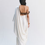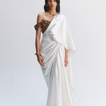 • Pre-stitched ivory satin drape with gathered pleats and asymmetric pallu