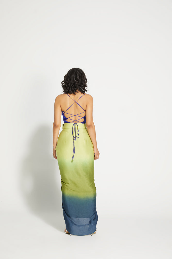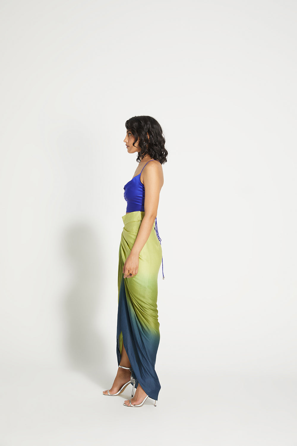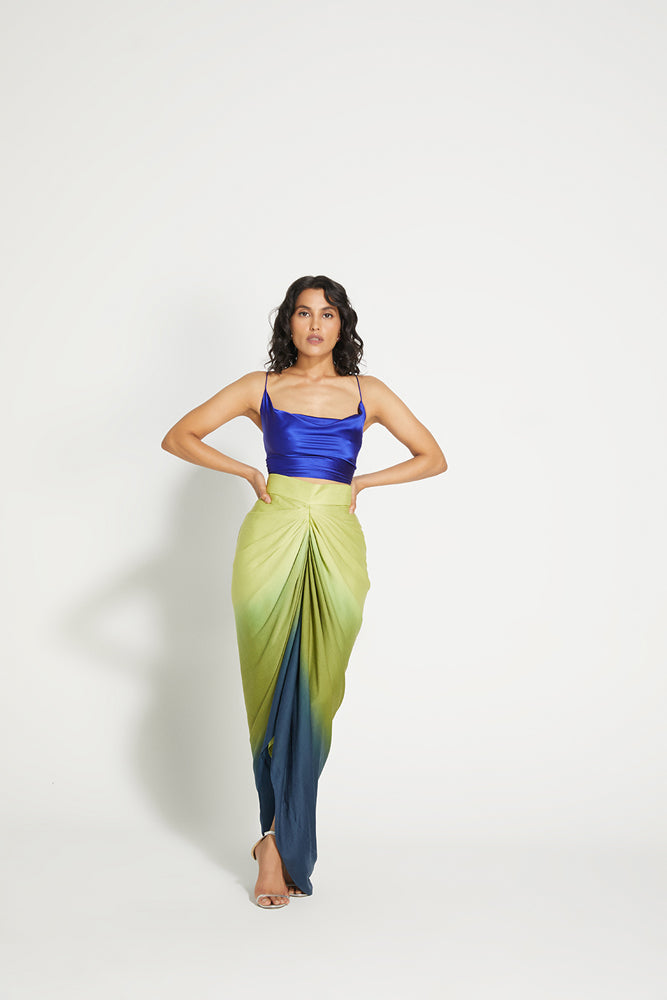 The Ombrè Draped Skirt features a straight fit sillhoutte with a front drape detail and a slightly longer back. Treated with a smooth ombrè colour finish, it's the best skirt for a beach destination. Closes on the side with a concealed zip.
