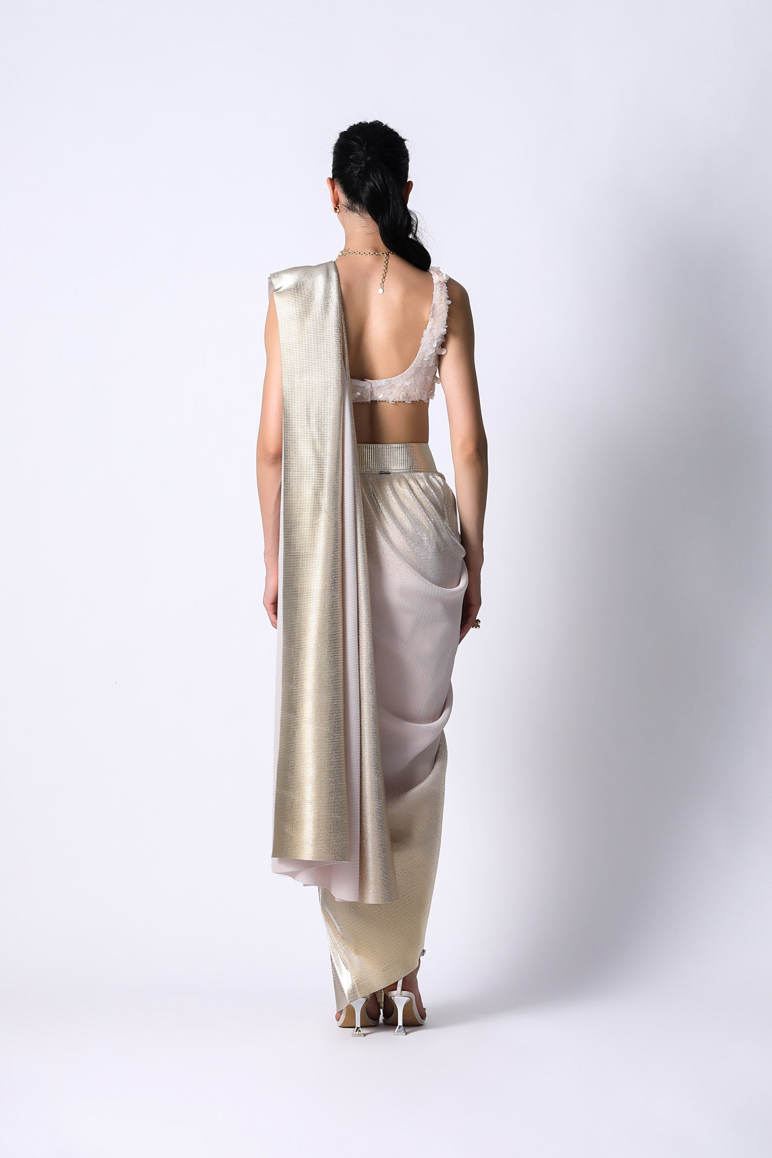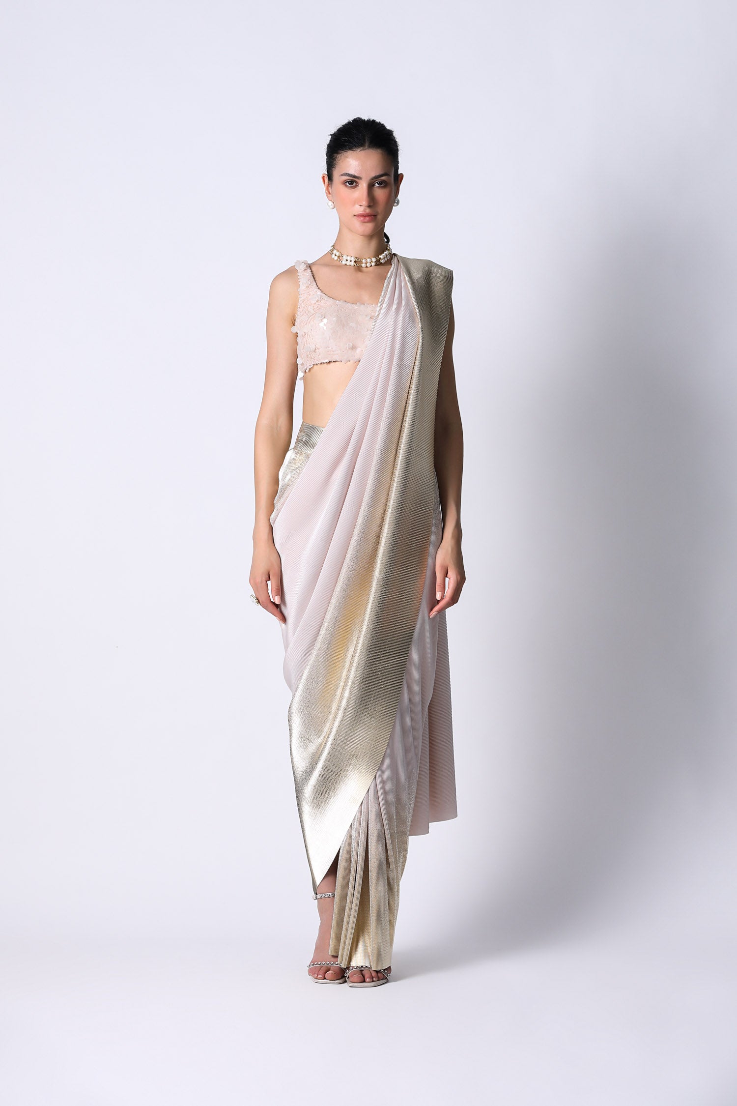 Our Midnight Sari made in our pleated metallic with an ombré foil detail is perfect for your upcoming festivities. Lightweight and easy to wear, it is pre-draped with an attached petticoat. Pair it with the RiRi blouse that is hand embroidered with transparent sequins. It has a square neckline and closes on the side with a zipper. Perfect outfit for those fun boho day weddings.