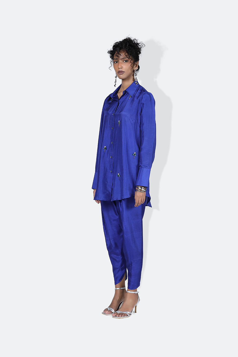 An exemplary shirt, the Samar Shirt is a number one effortlessly. Scattered with hand embroidered rhinestone  all over with  unique placement , the shirt is a mid thigh length and has full sleeves with a very minimal pleat detail on the back .Its  Our definition of a seasonless shirt.