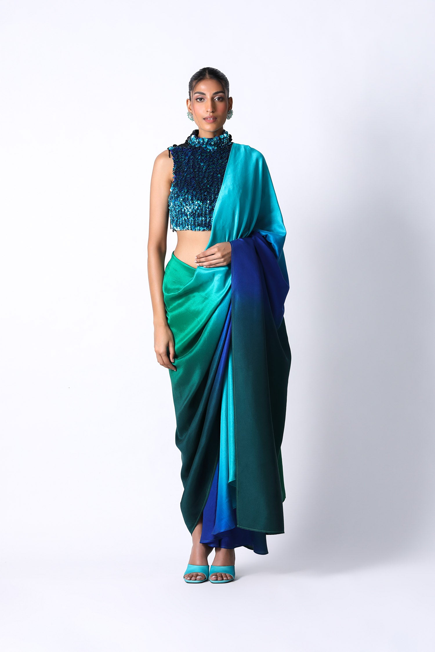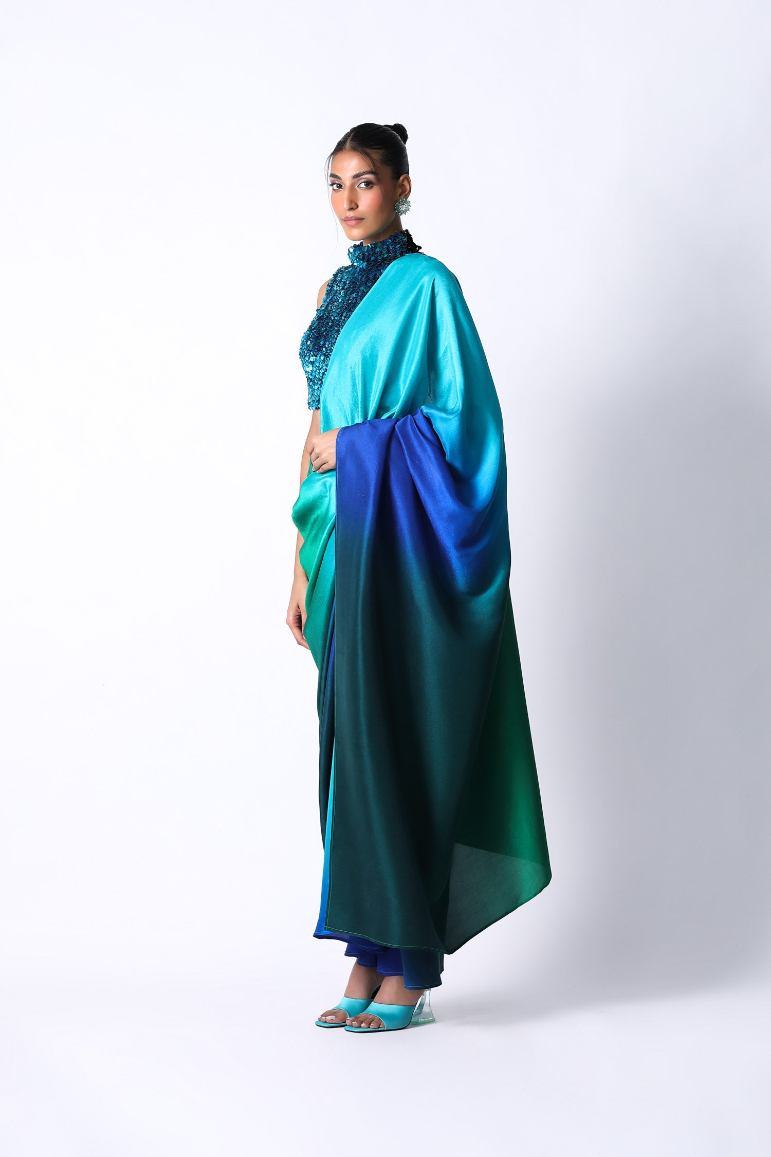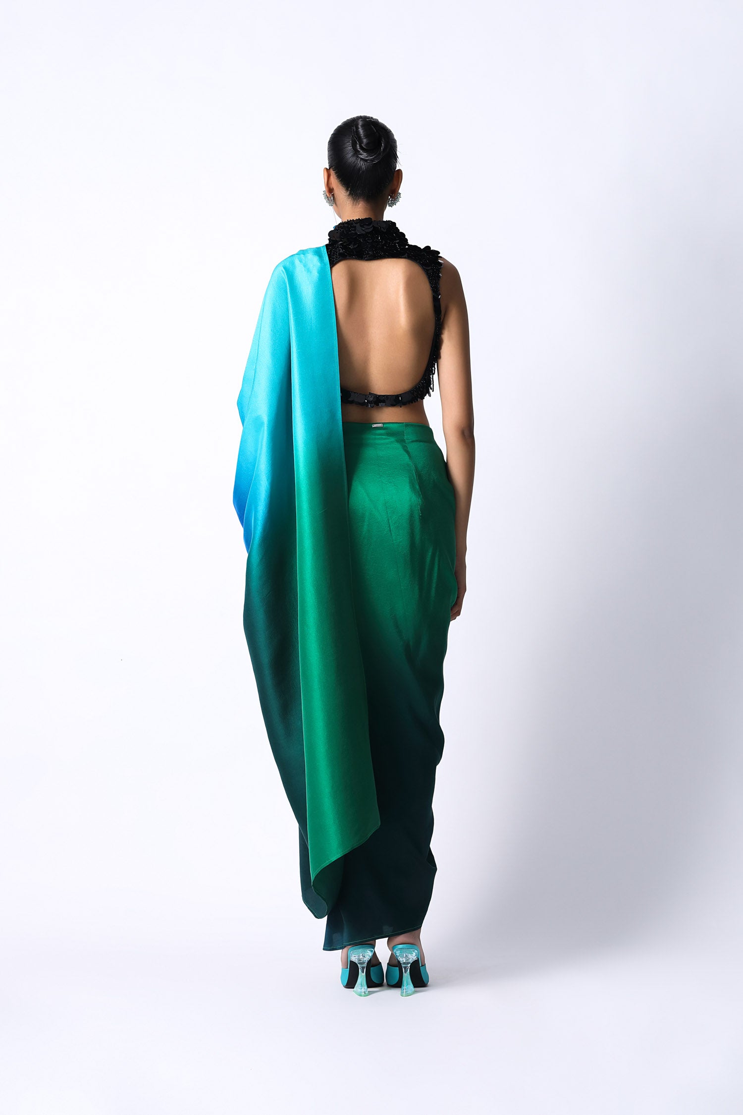 The classic Masai Godet Sari gets a new look with a 4 way ombré treatment. With a built in petticoat, the pallu gets attached to the waist with the clever use of a snap button and stays on while you are on the move. Pair it with the Tasha Blouse that has a high neck and a deep back cut out. Emerald in the front, it has a suprise colour block at the back.